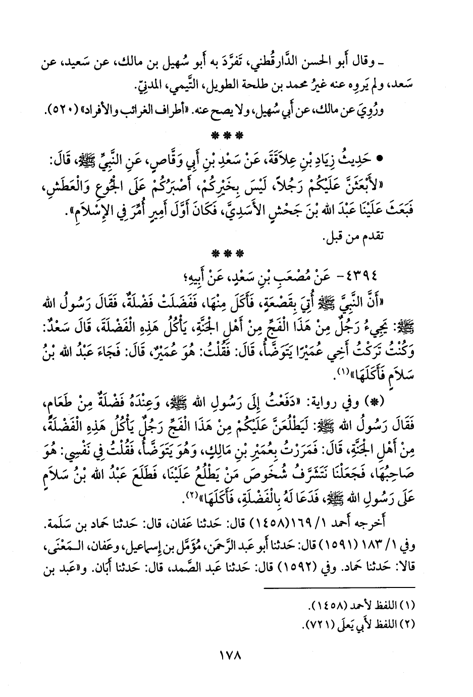 «أن النبي صَلى الله عَليه وسَلم أتي بقصعة، فأكل منها، ففضلت فضلة، فقال رسول الله صَلى الله عَليه وسَلم: يجيء رجل من هذا الفج من أهل الجنة، يأكل هذه الفضلة، قال سعد: وكنت تركت أخي عميرا يتوضأ، قال: فقلت: هو عمير، قال: فجاء عبد الله بن سلام فأكلها» (¬١).