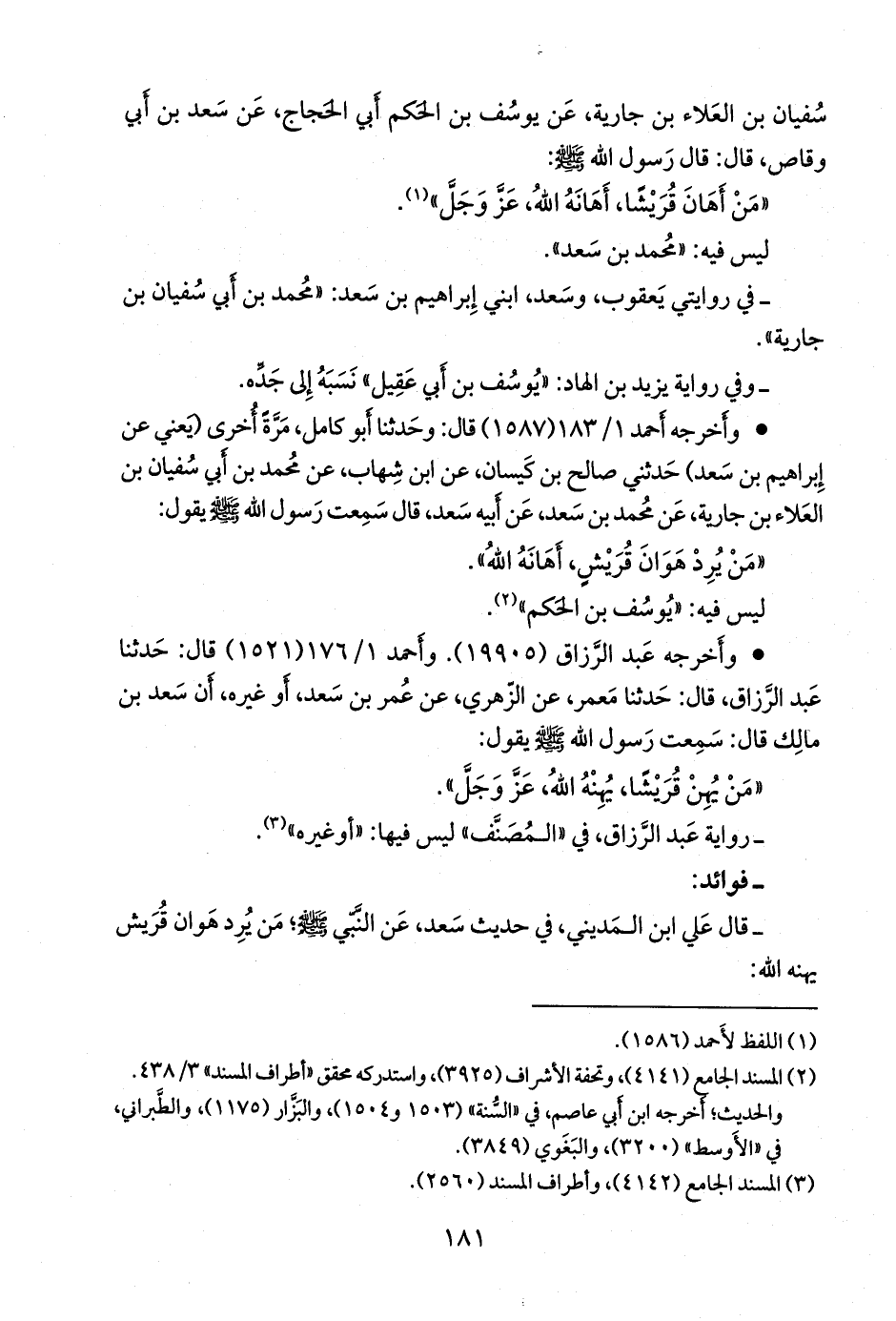 وعن محمد بن سعد، عن أبيه، أن رسول الله صَلى الله عَليه وسَلم قال: من يرد هوان قريش يهنه الله.