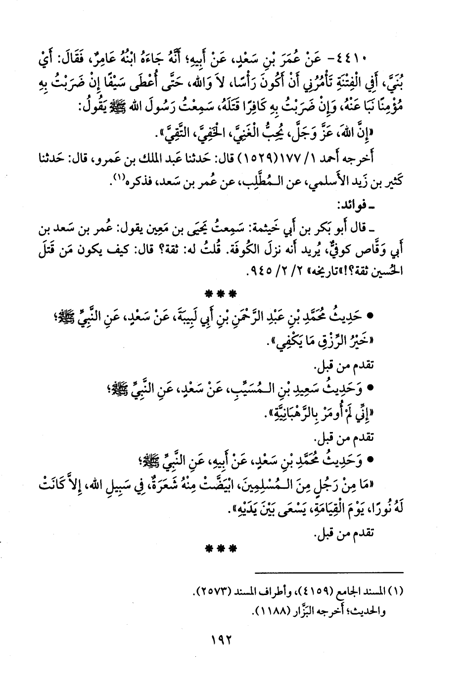٤٤١٠ - عن عمر بن سعد، عن أبيه؛ أنه جاءه ابنه عامر، فقال: أي بني، أفي الفتنة تأمرني أن أكون رأسا، لا والله، حتى أعطى سيفا إن ضربت به مؤمنا نبا عنه، وإن ضربت به كافرا قتله، سمعت رسول الله صَلى الله عَليه وسَلم يقول: