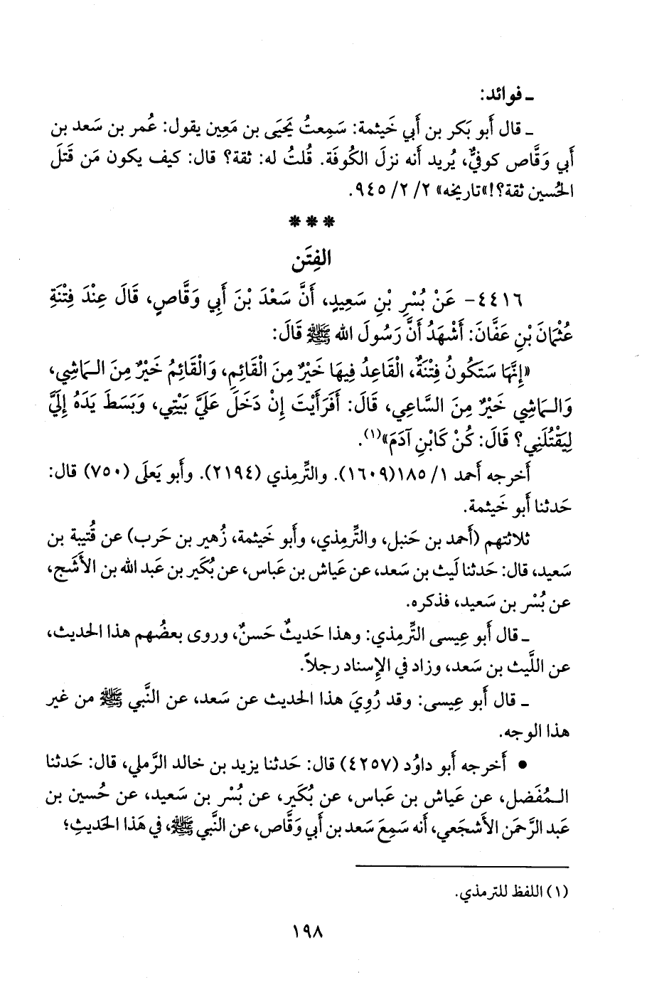 ٤٤١٦ - عن بُسر بن سعيد, أن سعد بن أبي وقاص, قال عند فتنة عثمان بن عفان: أشهد أن رسول الله صَلى الله عَليه وسَلم قال: