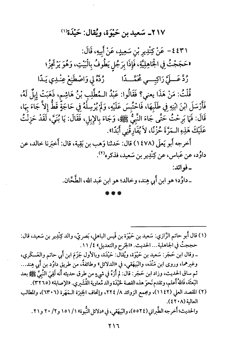 - وقال ابن حَجر: سعيد بن حيوة، ويقال: حيدة، وبالأول جزم ابن أبي حاتم والعسكري، وغيرهما، وروى ابن منده، والبيهقي في «الدلائل» وطائفة، من طريق داود بن أبي هند ... ثم ساق الحديث، وزاد ابن حجر: قال: لم أره في شيء من طرق حديثه أنه لقي النبي صَلى الله عَليه وسَلم بعد البعثة، فالله أعلم، وتقدم نحو هذه القصة لحيدة والد معاوية القشيري. «الإصابة» (٣٢٦٥).