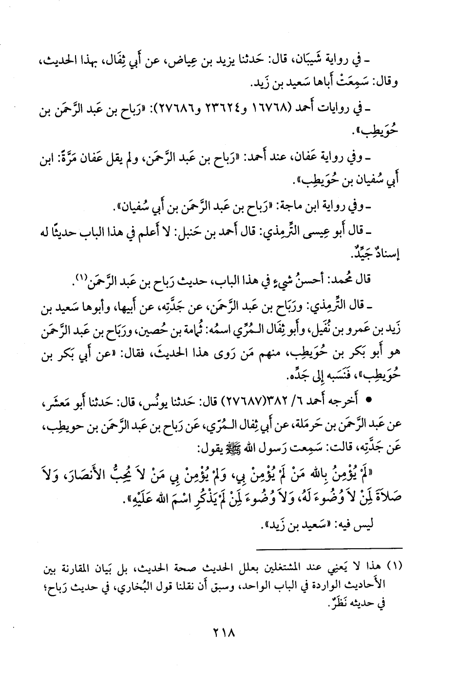 (¬١) هذا لا يعني عند المشتغلين بعلل الحديث صحة الحديث، بل بيان المقارنة بين الأحاديث الواردة في الباب الواحد، وسبق أن نقلنا قول البخاري، في حديث رباح؛ في حديثه نظر.