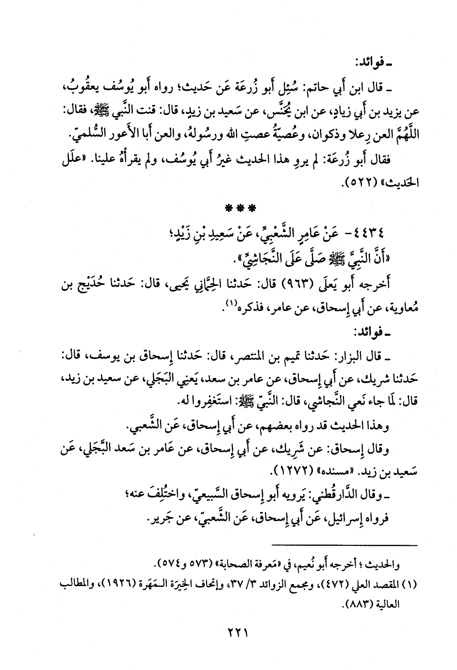 - قال البزار: حدثنا تميم بن المنتصر، قال: حدثنا إسحاق بن يوسف، قال: حدثنا شَريك، عن أبي إسحاق، عن عامر بن سعد، يعني البَجَلي، عن سعيد بن زيد، قال: لما جاء نعي النجاشي، قال: النبي صَلى الله عَليه وسَلم: استغفروا له.