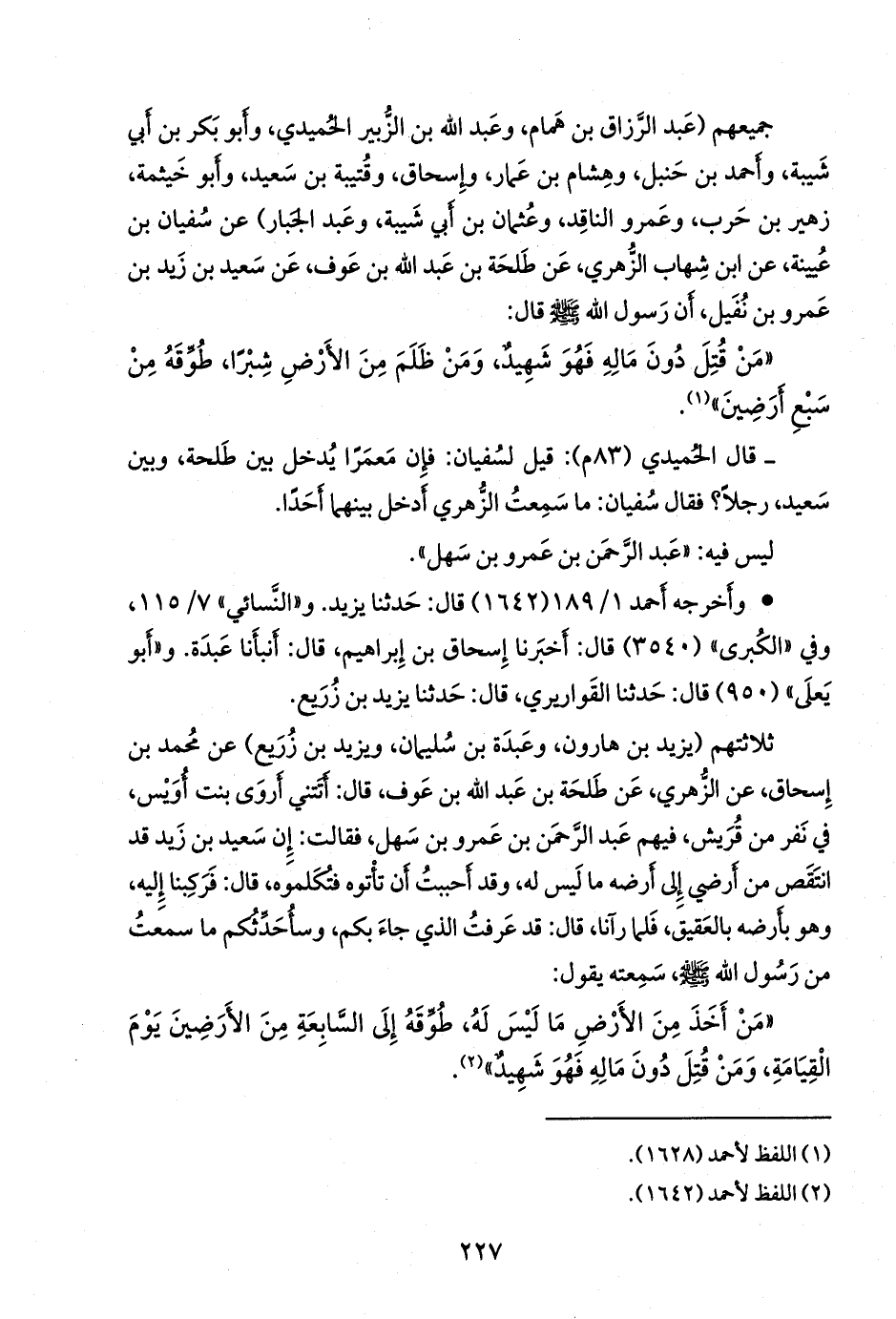 جميعهم (عبد الرزاق بن همام، وعبد الله بن الزبير الحميدي، وأَبو بكر بن أبي شيبة، وأحمد بن حنبل، وهشام بن عمار، وإسحاق، وقتيبة بن سعيد، وأَبو خيثمة زهير بن حرب، وعَمرو الناقد، وعثمان بن أبي شيبة، وعبد الجبار) عن سفيان بن عُيينة، عن ابن شهاب الزُّهْري، عن طلحة بن عبد الله بن عوف، عن سعيد بن زيد بن عَمرو بن نفيل، أن رسول الله صَلى الله عَليه وسَلم قال: