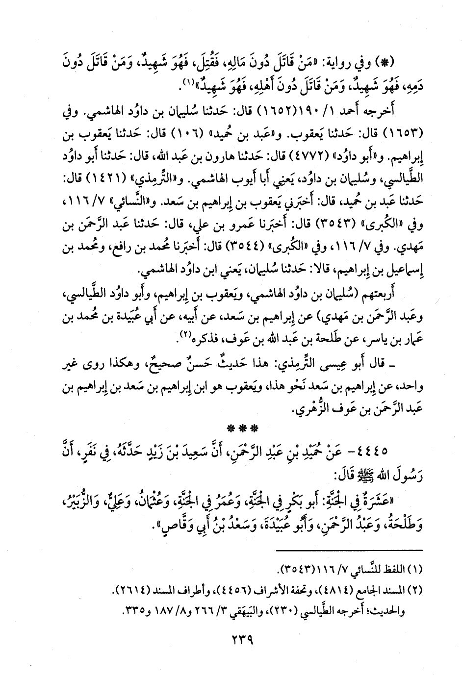 ٤٤٤٥ - عن حميد بن عبد الرَّحمَن, أن سعيد بن زيد حدثه, في نفر, أن رسول الله صَلى الله عَليه وسَلم قال: