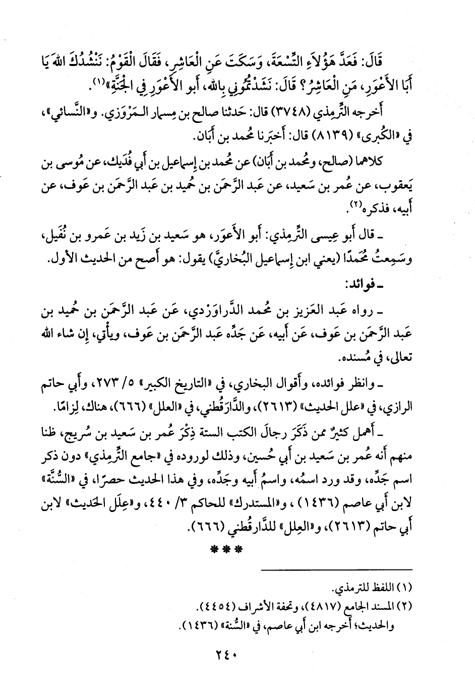 - أهمل كثير ممن ذكر رجال الكتب الستة ذكر عمر بن سعيد بن سريج، ظنا منهم أنه عمر بن سعيد بن أبي حسين، وذلك لوروده في «سنن التِّرمِذي» دون ذكر اسم جده، وقد ورد اسمه، واسم أبيه وجده، وفي هذا الحديث حصرا في «السُّنَّة» لابن أبي عاصم، و «علل الحديث» لابن أبي حاتم (٢٦١٣)، و «العلل» للدارقطني (٦٦٦).