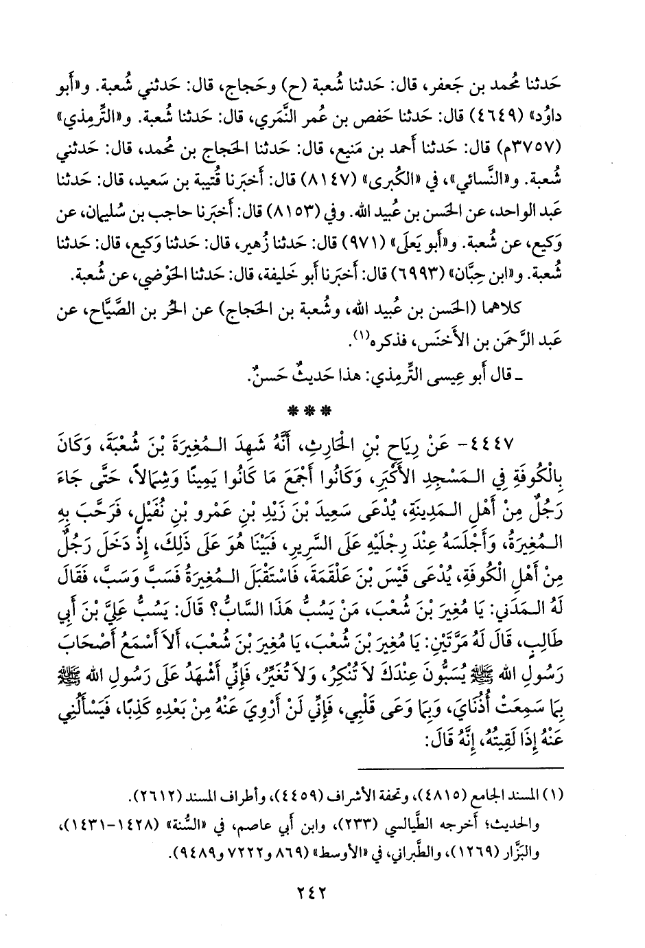 ٤٤٤٧ - عن رياح بن الحارث، أنه شهد المغيرة بن شعبة، وكان بالكوفة في المسجد الأكبر، وكانوا أجمع ما كانوا يمينا وشمالا، حتى جاء رجل من أهل المدينة، يدعى سعيد بن زيد بن عَمرو بن نفيل, فرحب به المغيرة، وأجلسه عند رجليه على السرير, فبينا هو على ذلك، إذ دخل رجل من أهل الكوفة، يدعى قيس بن علقمة, فاستقبل المغيرة فسب وسب، فقال له المدني: يا مغير بن شعب, من يسب هذا الساب؟ قال: يسب علي بن أبي طالب، قال له مرتين: يا مغير بن شعب, يا مغير بن شعب, ألا أسمع أصحاب رسول الله صَلى الله عَليه وسَلم يسبون عندك لا تنكر، ولا تغير, فإني أشهد على رسول الله صَلى الله عَليه وسَلم بما سمعت أذناي، وبما وعى قلبي، فإني لن أروي عنه من بعده كذبا، فيسألني عنه إذا لقيته، إنه قال: