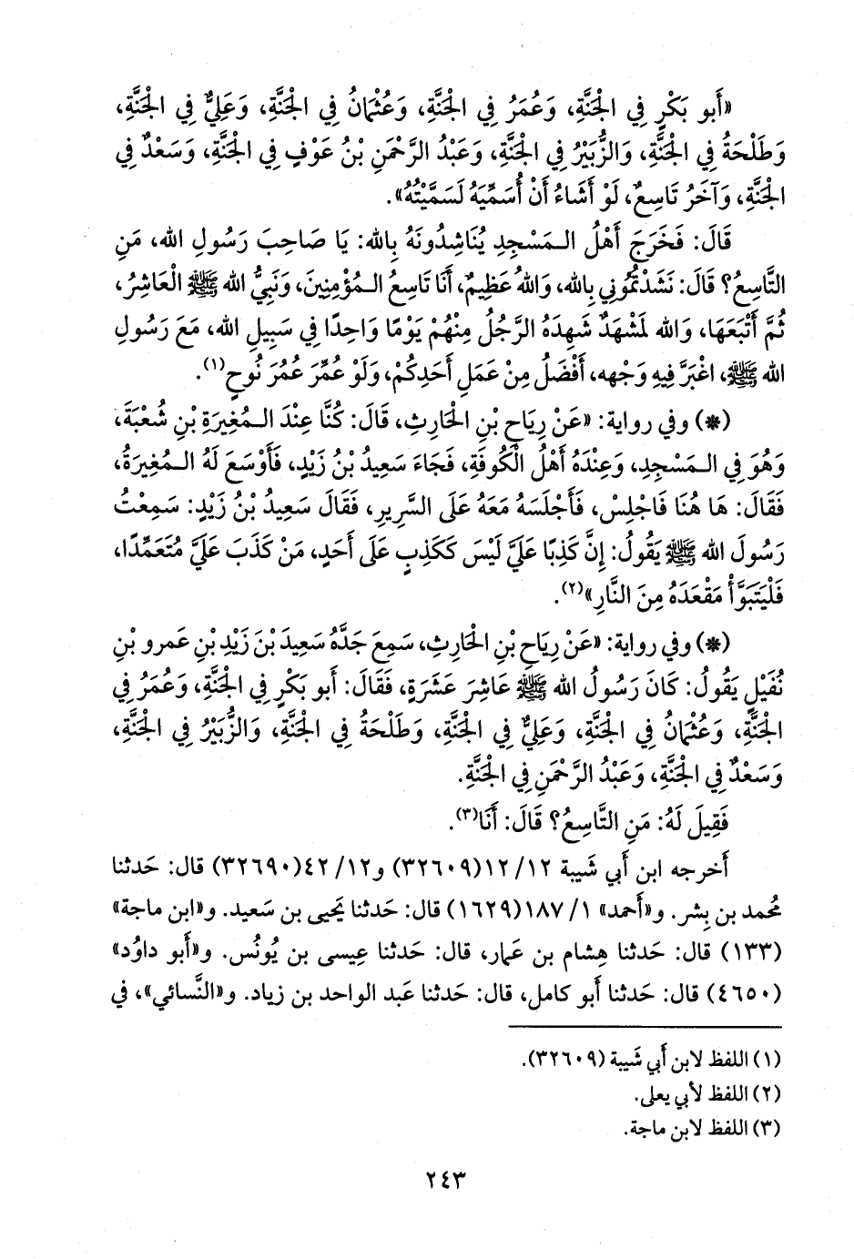 ـ وفي رواية: «عن رياح بن الحارث، سمع جده سعيد بن زيد بن عَمرو بن نفيل يقول: كان رسول الله صَلى الله عَليه وسَلم عاشر عشرة، فقال: أَبو بكر في الجنة، وعمر في الجنة، وعثمان في الجنة، وعلي في الجنة، وطلحة في الجنة، والزبير في الجنة، وسعد في الجنة، وعبد الرَّحمَن في الجنة.