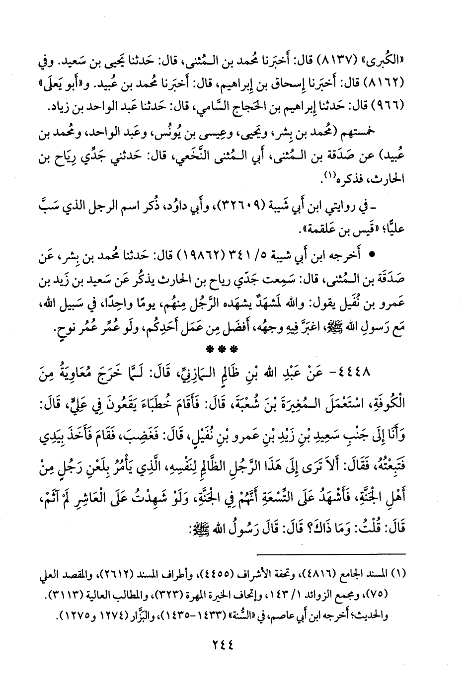 ٤٤٤٨ - عن عبد الله بن ظالم المازني، قال: لما خرج معاوية من الكوفة، استعمل المغيرة بن شعبة، قال: فأقام خطباء يقعون في علي، قال: وأنا إلى جنب سعيد بن زيد بن عَمرو بن نفيل، قال: فغضب، فقام فأخذ بيدي فتبعته، فقال: ألا ترى إلى هذا الرجل الظالم لنفسه، الذي يأمر بلعن رجل من أهل الجنة، فأشهد على التسعة أنهم في الجنة، ولو شهدت على العاشر لم آثم، قال: قلت: وما ذاك؟ قال: قال رسول الله صَلى الله عَليه وسَلم: