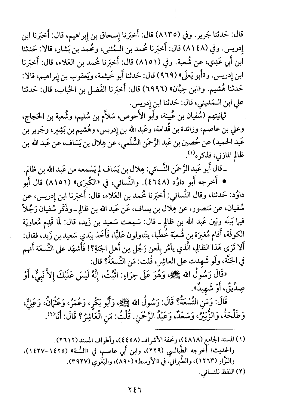 كلاهما (أَبو داود سليمان بن الأشعث، وأَحمد بن شعيب النَّسَائي) عن أَبي كُريب محمد بن العلاء، عن عبد الله بن إِدريس، عن سفيان الثوري، عن منصور ابن المُعتَمِر، عن هلال بن يَسَاف، عن عبد الله بن ظالم، وذكر سفيان رجلا فيما بينه وبين عبد الله بن ظالم ـ قال: سمعت سعيد بن زيد، قال: لما قدم معاوية الكوفة، أقام مغيرة بن شعبة خطباء يتناولون عليا، فأخذ بيدي سعيد بن زيد، فقال: ألا ترى هذا الظالم، الذي يأمر بلعن رجل من أهل الجنة؟! فأشهد على التسعة أنهم في الجنة، ولو شهدت على العاشر، قلت: من التسعة؟ قال: