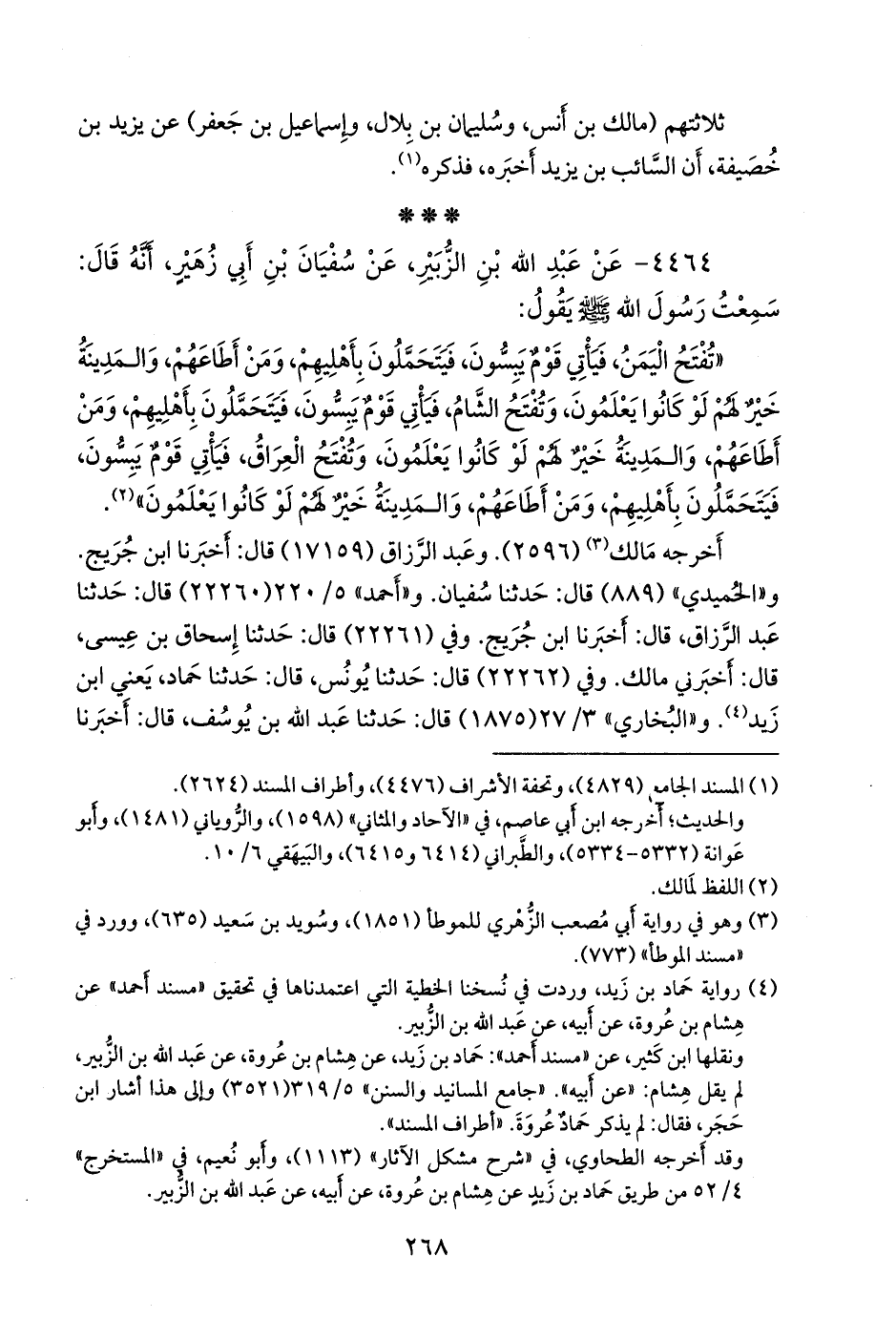 (¬٣) رواية حماد بن زيد، وردت في نسخنا الخطية التي اعتمدناها في تحقيق «مسند أحمد» عن هشام بن عروة، عن أبيه، عن عبد الله بن الزبير.