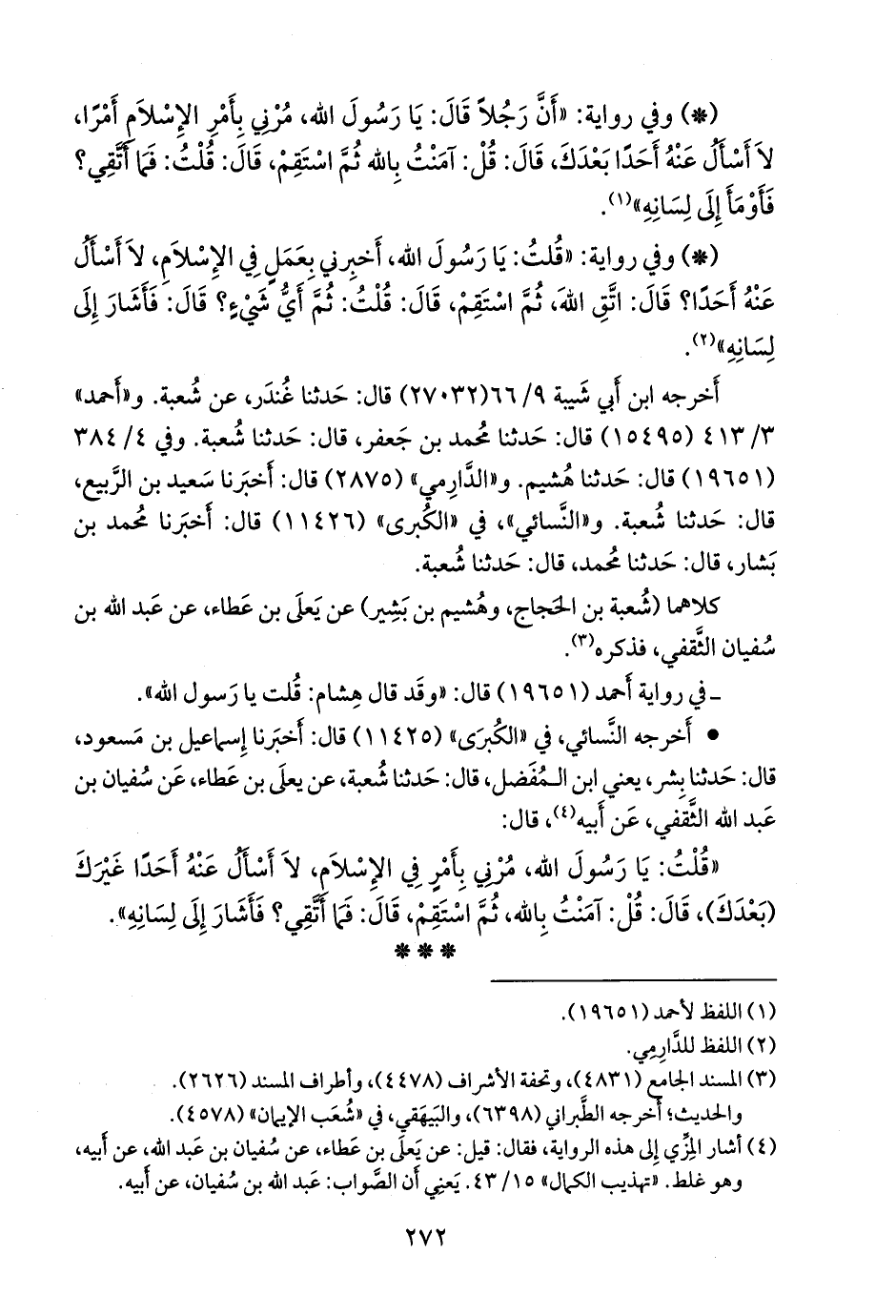 «قلت: يا رسول الله، مرني بأمر في الإسلام، لا أسأل عنه أحدا غيرك (بعدك)، قال: قل: آمنت بالله، ثم استقم، قال: فما أتقي؟ فأشار إلى لسانه».