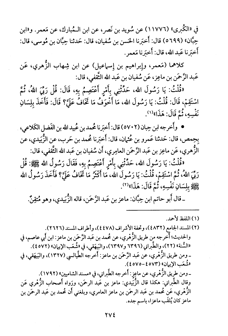 (¬١) أخرجه البيهقي في «شعب الإيمان» (٤٩٢١)، من طريق إسحاق بن إبراهيم، وهو الدَّبَري، راوي «المُصَنَّف»، قال: أخبرنا عبد الرزاق، عن مَعمَر، عن الزُّهْري؛ أن سفيان بن عبد الله الثقفي، قال: قلت: يا رسول الله، قال: حدثني بحديث أعتصم به، قال: قل آمنت بالله، ثم استقم، قال: قلت: ما أخوف ما يتخوف به علي؟ قال: فأخذ بلسان نفسه، ثم قال: هذا.