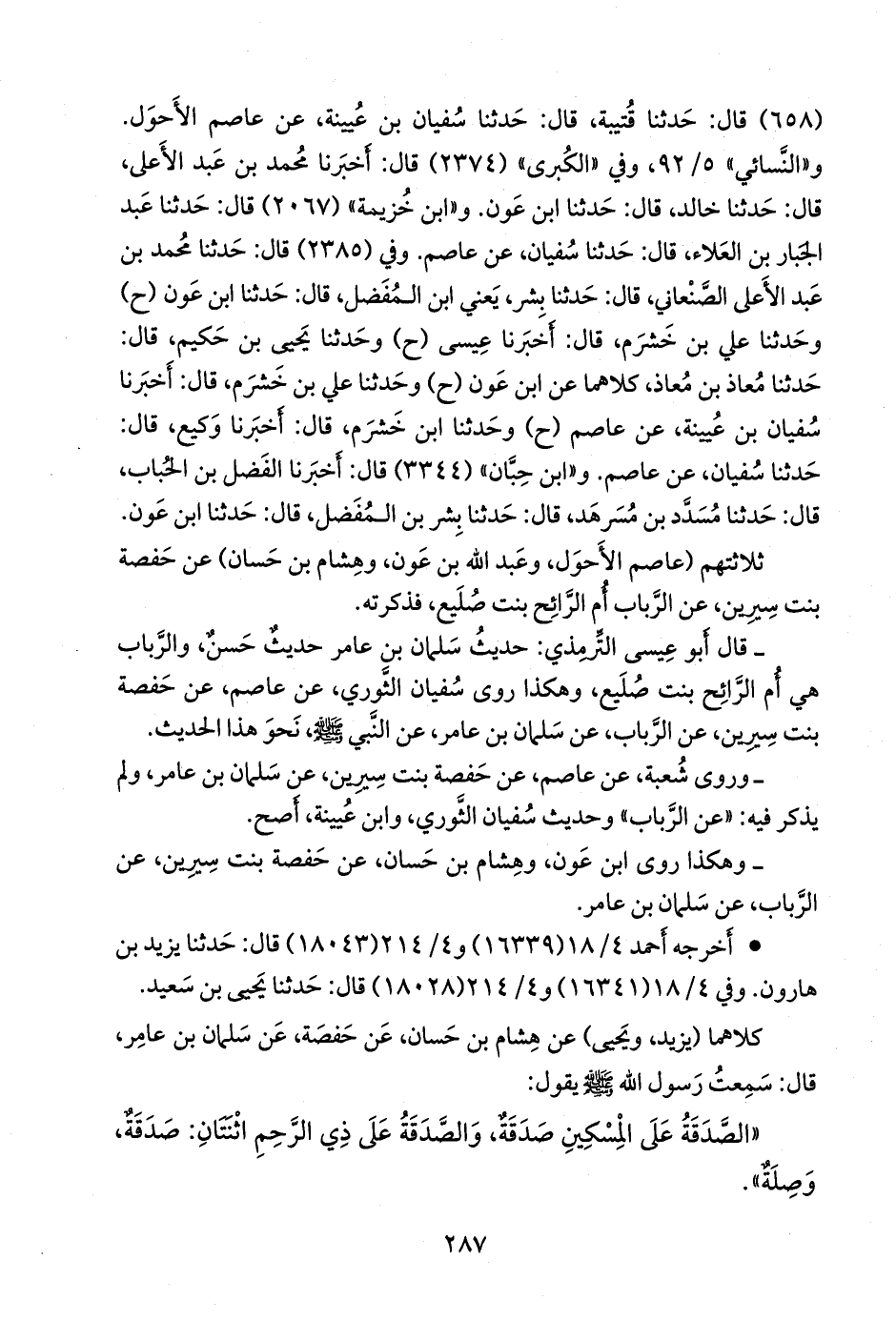- وروى شعبة، عن عاصم، عن حفصة بنت سِيرين، عن سلمان بن عامر، ولم يذكر فيه: «عن الرباب» وحديث سفيان الثوري، وابن عُيينة، أصح.