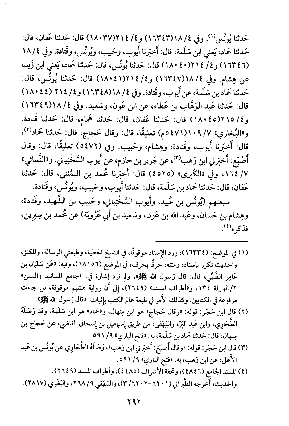 (¬١) قال ابن حجر: قوله: «وقال حجاج» هو ابن منهال، و «حماد» هو ابن سلمة، وقد وصله الطحاوي، وابن عبد البَر، والبيهقي، من طريق إسماعيل بن إسحاق القاضي، عن حجاج بن مِنهال، قال: حدثنا حماد بن سلمة، به. «فتح الباري» ٩/ ٥٩١.
