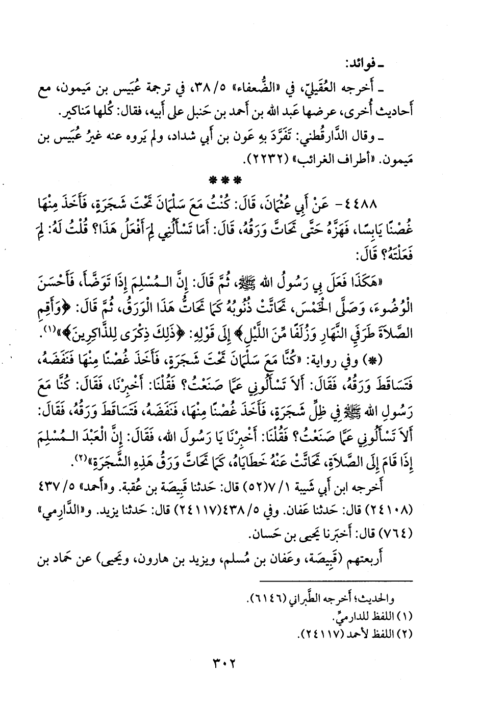 ٤٤٨٨ - عن أبي عثمان, قال: كنت مع سلمان تحت شجرة, فأخذ منها غصنا يابسا, فهزه حتى تحات ورقه, قال: أما تسألني لم أفعل هذا؟ قلت له: لم فعلته؟ قال: