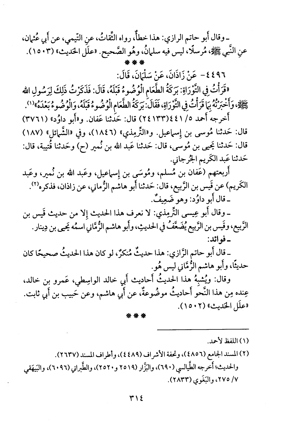 أربعتهم (عفان بن مسلم، وموسى بن إسماعيل، وعبد الله بن نُمير، وعبد الكريم) عن قيس بن الربيع، قال: حدثنا أَبو هاشم الرماني، عن زاذان، فذكره (¬٢).