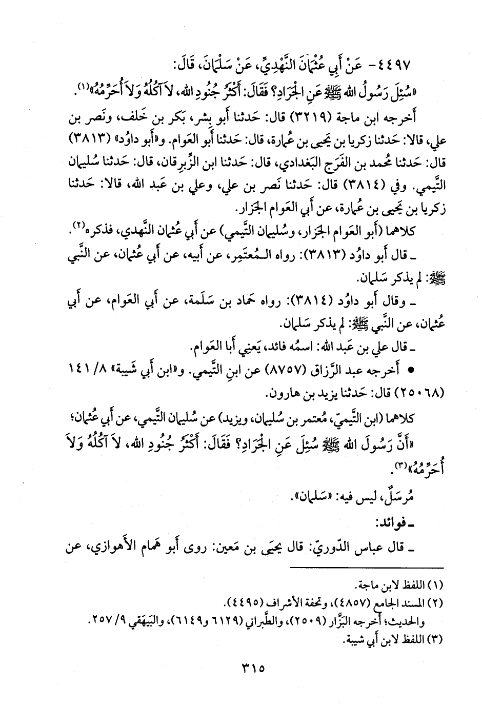 سليمان التيمي، عن أبي عثمان، عن سلمان، عن النبي صَلى الله عَليه وسَلم في الجراد؛ أكثر جنود الله في الأرض.