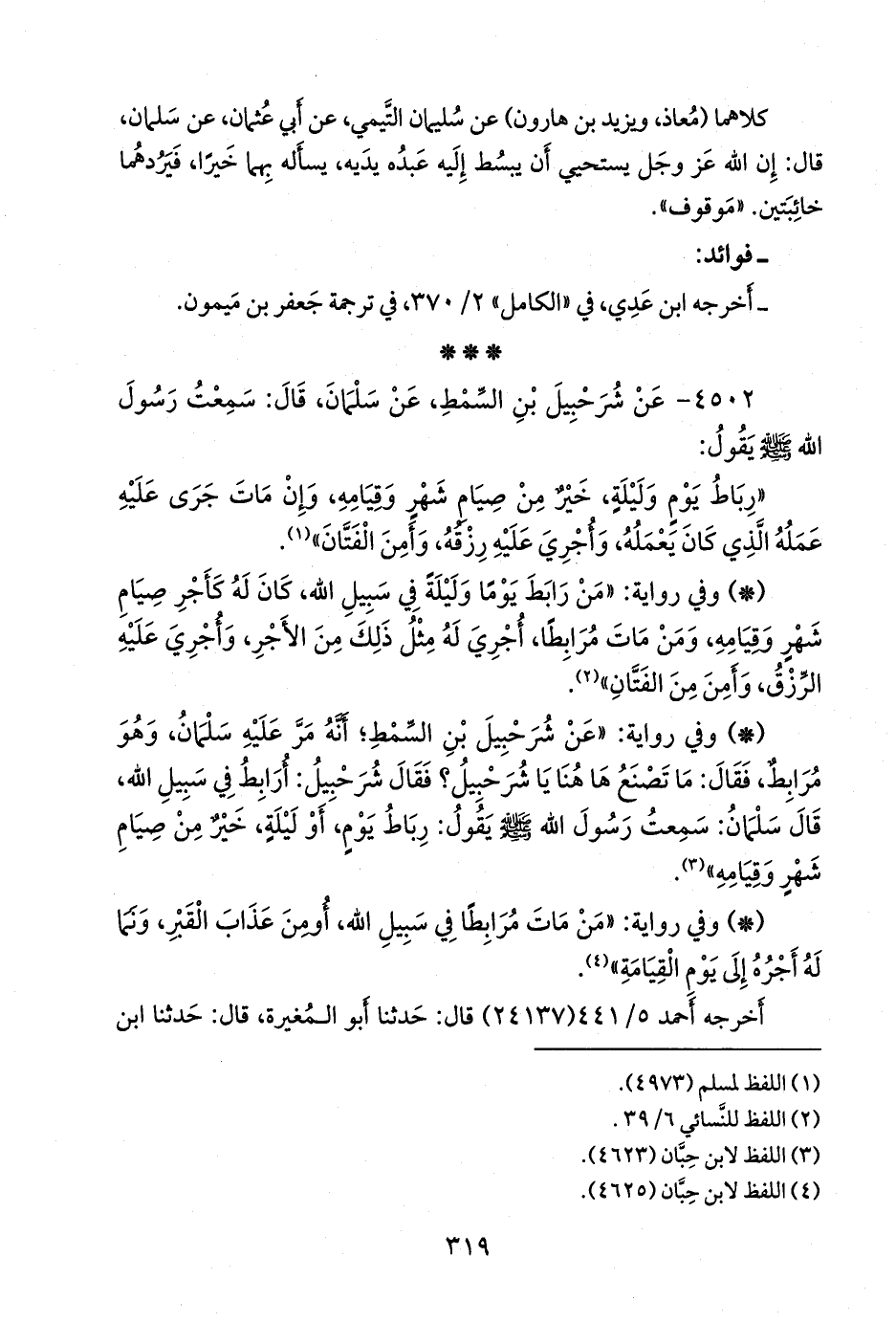 ثوبان، قال: حدثني من سمع خالد بن مَعدان. و «مسلم» ٦/ ٥٠ (٤٩٧٣) قال: حدثنا عبد الله بن عبد الرَّحمَن بن بَهرام الدَّارِمي، قال: حدثنا أَبو الوليد الطيالسي، قال: حدثنا ليث، يعني ابن سعد، عن أيوب بن موسى، عن مكحول. وفي ٦/ ٥١ (٤٩٧٤) قال: حدثني أَبو الطاهر، قال: أخبرنا ابن وهب، عن عبد الرَّحمَن بن شريح، عن عبد الكريم بن الحارث، عن أبي عبيدة بن عُقبة.