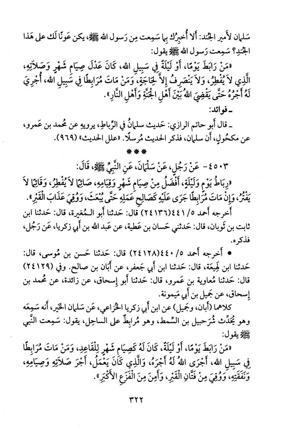 «رباط يوم وليلة، في سبيل الله، كصيام شهر وقيامه، إن مات جرى عليه أجر المرابط حتى يبعث، ويؤمن الفتان».