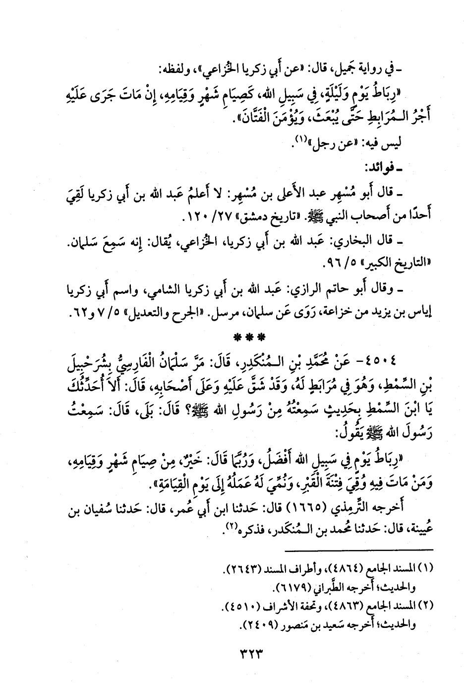 ٤٥٠٤ - عن محمد بن المُنكدِر، قال: مر سلمان الفارسي بشُرحبيل بن السِّمْط، وهو في مرابط له، وقد شق عليه وعلى أصحابه، قال: ألا أحدثك يا ابن السمط بحديث سمعته من رسول الله صَلى الله عَليه وسَلم؟ قال: بلى، قال: سمعت رسول الله صَلى الله عَليه وسَلم يقول: