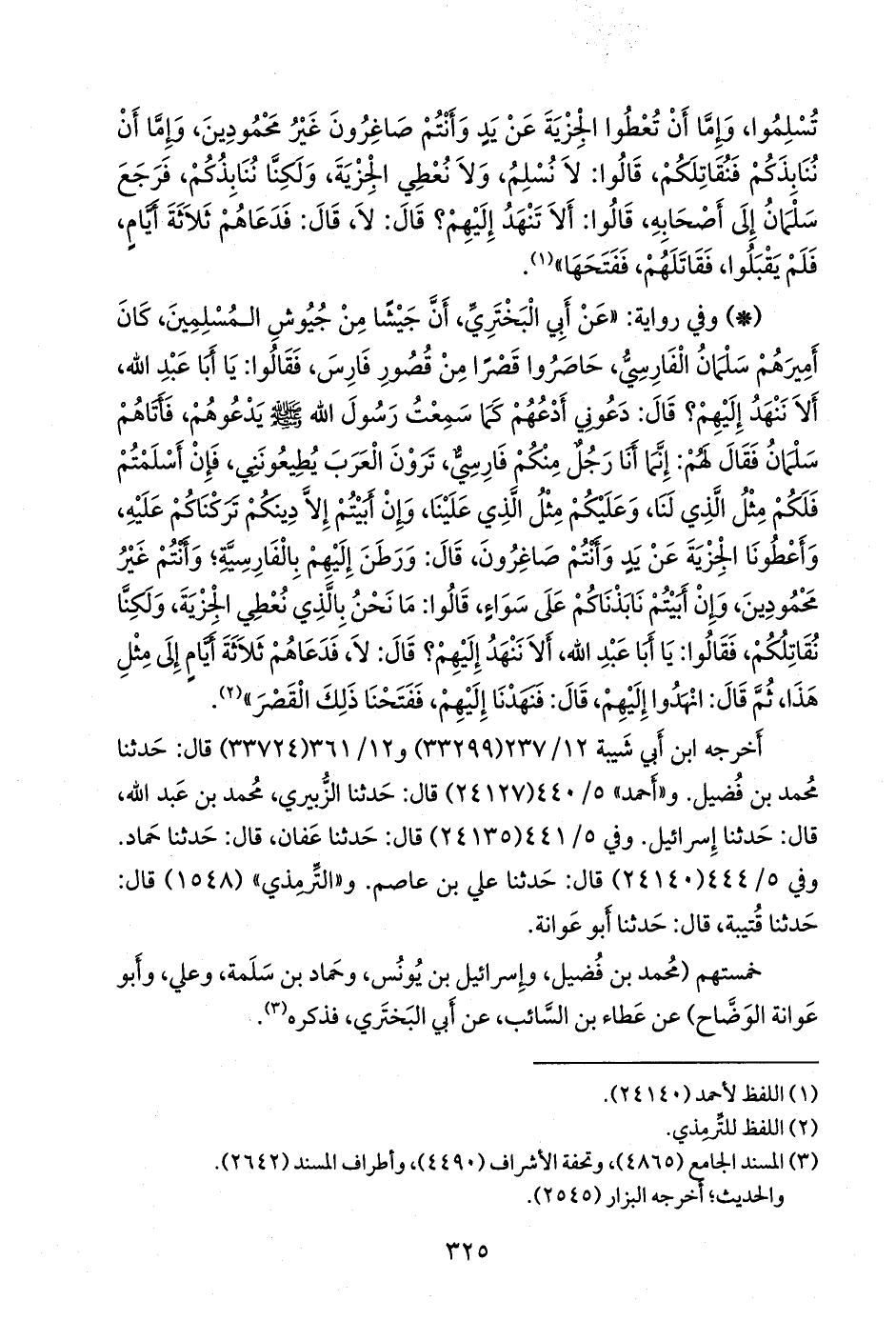 - وفي رواية: «عن أبي البَختَري، أن جيشا من جيوش المسلمين، كان أميرهم سلمان الفارسي، حاصروا قصرا من قصور فارس، فقالوا: يا أبا عبد الله، ألا ننهد إليهم؟ قال: دعوني أدعهم كما سمعت رسول الله صَلى الله عَليه وسَلم يدعوهم، فأتاهم سلمان فقال لهم: إنما أنا رجل منكم فارسي، ترون العرب يطيعونني، فإن أسلمتم فلكم مثل الذي لنا، وعليكم مثل الذي علينا، وإن أبيتم إلا دينكم تركناكم عليه، وأعطونا الجزية عن يد وأنتم صاغرون، قال: ورطن إليهم بالفارسية؛ وأنتم غير محمودين، وإن أبيتم نابذناكم على سواء، قالوا: ما نحن بالذي نعطي الجزية، ولكنا نقاتلكم، فقالوا: يا أبا عبد الله، ألا ننهد إليهم؟ قال: لا، فدعاهم ثلاثة أيام إلى مثل هذا، ثم قال: انهدوا إليهم، قال: فنهدنا إليهم، ففتحنا ذلك القصر» (¬١).