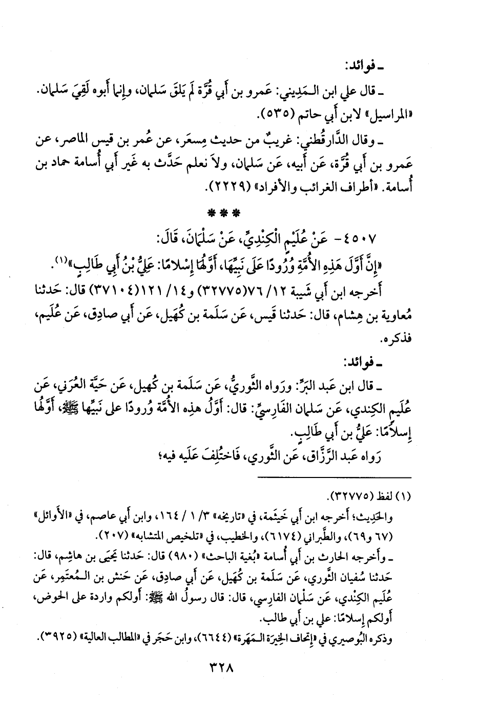 - وقال الدارقُطني: غريبٌ من حديث مِسعَر، عن عمر بن قيس الماصر، عن عَمرو بن أَبي قُرة، عن أَبيه، عن سَلمان، ولا نعلم حَدث به غير أَبي أُسامة حماد ابن أُسامة. «أطراف الغرائب والأفراد» (٢٢٢٩).