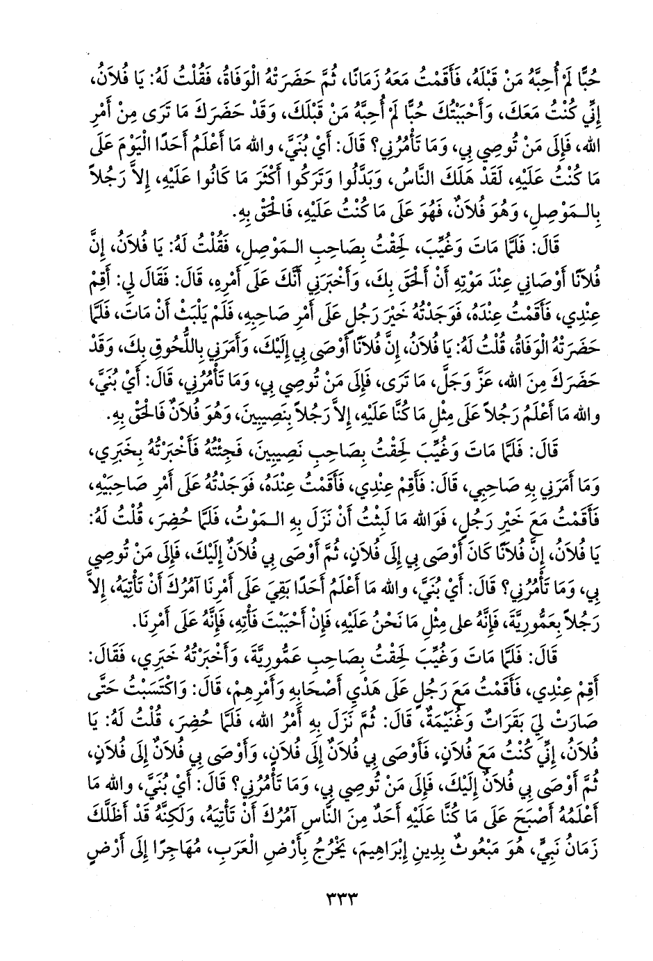 قَالَ: فَلَمَّا مَاتَ وَغُيِّبَ لَحِقْتُ بِصَاحِبِ عَمُّورِيَّةَ، وَأَخْبَرْتُهُ خَبَرِي، فَقَالَ: أَقِمْ عِنْدِي، فَأَقَمْتُ مَعَ رَجُلٍ عَلَى هَدْيِ أَصْحَابِهِ وَأَمْرِهِمْ، قَالَ: وَاكْتَسَبْتُ حَتَّى كَانَ لِي بَقَرَاتٌ وَغُنَيْمَةٌ، قَالَ: ثُمَّ نَزَلَ بِهِ أَمْرُ اللهِ، فَلَمَّا حُضِرَ، قُلْتُ لَهُ: يَا فُلَانُ إِنِّي كُنْتُ مَعَ فُلَانٍ، فَأَوْصَى بِي فُلَانٌ إِلَى فُلَانٍ، وَأَوْصَى بِي فُلَانٌ إِلَى فُلَانٍ، ثُمَّ أَوْصَى بِي فُلَانٌ إِلَيْكَ، فَإِلَى مَنْ تُوصِي بِي، وَمَا تَأْمُرُنِي، قَالَ: أَيْ بُنَيَّ وَاللهِ مَا أَعْلَمُهُ أَصْبَحَ عَلَى مَا كُنَّا عَلَيْهِ أَحَدٌ مِنَ النَّاسِ آمُرُكَ أَنْ تَأْتِيَهُ، وَلَكِنَّهُ قَدْ أَظَلَّكَ زَمَانُ نَبِيٍّ، هُوَ مَبْعُوثٌ بِدِينِ إِبْرَاهِيمَ، يَخْرُجُ بِأَرْضِ العَرَبِ، مُهَاجِرًا إِلَى أَرْضٍ
