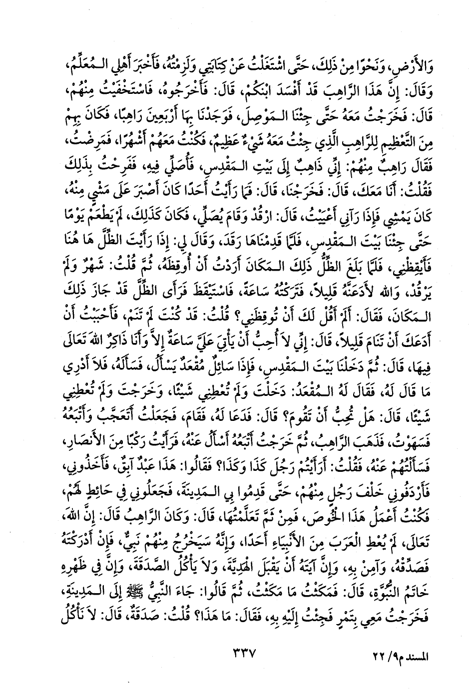 قال: ثم دخلنا بيت المقدس، فإذا سائل مقعد يسأل، فسأله، فلا أدري ما قال له، فقال له المقعد: دخلت ولم تعطني شيئا، وخرجت ولم تعطني شيئا، قال: هل تحب أن تقوم؟ قال: فدعا له، فقام، فجعلت أتعجب وأتبعه فسهوت، فذهب الراهب، ثم خرجت أتبعه أسأل عنه، فرأيت ركبا من الأنصار، فسألتهم عنه، فقلت: أرأيتم رجل كذا وكذا؟ فقالوا: هذا عبد آبق، فأخذوني، فأردفوني خلف رجل منهم، حتى قدموا بي المدينة، فجعلوني في حائط لهم، فكنت أعمل هذا الخوص، فمن ثم تعلمتها، قال: وكان الراهب قال: إن الله، تعالى، لم يعط العرب من الأنبياء أحدا، وإنه سيخرج منهم نبي، فإن أدركته فصدقه، وآمن به، وإن آيته أن يقبل الهدية، ولا يأكل الصدقة، وإن في ظهره خاتم النبوة، قال: فمكثت ما مكثت، ثم قالوا: جاء النبي صَلى الله عَليه وسَلم إلى المدينة، فخرجت معي بتمر فجئت إليه به، فقال: ما هذا؟ قلت: صدقة، قال: لا نأكل