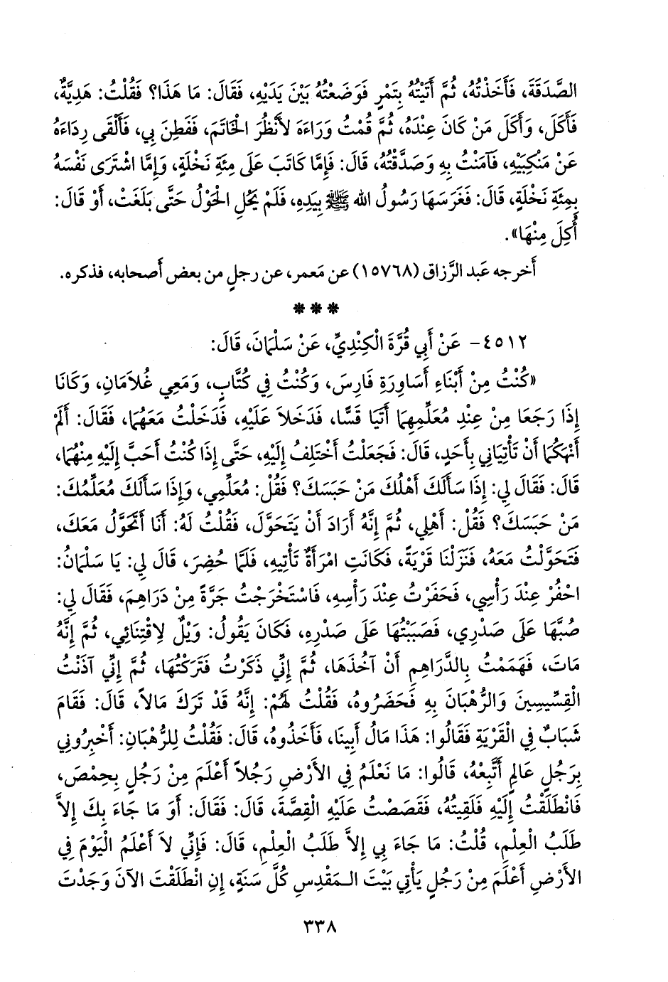 «كنت من أبناء أساورة فارس، وكنت في كتاب، ومعي غلامان, وكانا إذا رجعا من عند معلمهما أتيا قسا، فدخلا عليه، فدخلت معهما، فقال: ألم أنهكما أن تأتياني بأحد، قال: فجعلت أختلف إليه، حتى إذا كنت أحب إليه منهما، قال: فقال لي: إذا سألك أهلك من حبسك؟ فقل: معلمي, وإذا سألك معلمك: من حبسك؟ فقل: أهلي، ثم إنه أراد أن يتحول, فقلت له: أنا أتحول معك, فتحولت معه، فنزلنا قرية, فكانت امرأة تأتيه، فلما حضر، قال لي: يا سلمان: احفر عند رأسي, فحفرت عند رأسه، فاستخرجت جرة من دراهم، فقال لي: صبها على صدري, فصببتها على صدره, فكان يقول: ويل لاقتنائي، ثم إنه مات، فهممت بالدراهم أن آخذها، ثم إني ذكرت فتركتها، ثم إني آذنت القسيسين والرهبان به فحضروه، فقلت لهم: إنه قد ترك مالا، قال: فقام شباب في القرية فقالوا: هذا مال أبينا, فأخذوه، قال: فقلت للرهبان: أخبروني برجل عالم أتبعه، قالوا: ما نعلم في الأرض رجلا أعلم من رجل بحمص, فانطلقت إليه فلقيته، فقصصت عليه القصة، قال: فقال: أو ما جاء بك إلا طلب العلم, قلت: ما جاء بي إلا طلب العلم، قال: فإني لا أعلم اليوم في الأرض أعلم من رجل يأتي بيت المقدس كل سنة, إن انطلقت الآن وجدت