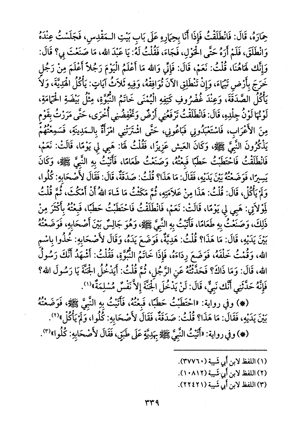 قال: فإني والله ما أعلم اليوم رجلا أعلم من رجل خرج بأرض تيماء, وإن تنطلق الآن توافقه, وفيه ثلاث آيات: يأكل الهدية، ولا يأكل الصدقة, وعند غضروف كتفه اليمنى خاتم النبوة، مثل بيضة الحمامة، لونها لون جلده، قال: فانطلقت ترفعني أرض وتخفضني أخرى، حتى مررت بقوم من الأعراب، فاستعبدوني فباعوني، حتى اشترتني امرأة بالمدينة, فسمعتهم يذكرون النبي صَلى الله عَليه وسَلم وكان العيش عزيزا، فقلت لها: هبي لي يوما، قالت: نعم, فانطلقت فاحتطبت حطبا فبعته, وصنعت طعاما، فأتيت به النبي صَلى الله عَليه وسَلم وكان يسيرا، فوضعته بين يديه، فقال: ما هذا؟ قلت: صدقة، قال: فقال لأصحابه: كلوا, ولم يأكل، قال: قلت: هذا من علامته، ثم مكثت ما شاء الله أن أمكث، ثم قلت لمولاتي: هبي لي يوما، قالت: نعم, فانطلقت فاحتطبت حطبا، فبعته بأكثر من ذلك، وصنعت به طعاما, فأتيت به النبي صَلى الله عَليه وسَلم وهو جالس بين أصحابه، فوضعته بين يديه، قال: ما هذا؟ قلت: هدية, فوضع يده، وقال لأصحابه: خذوا باسم الله, وقمت خلفه, فوضع رداءه، فإذا خاتم النبوة، فقلت: أشهد أنك رسول الله، قال: وما ذاك؟ فحدثته عن الرجل، ثم قلت: أيدخل الجنة يا رسول الله؟ فإنه حدثني أنك نبي، قال: لن يدخل الجنة إلا نفس مسلمة» (¬١).