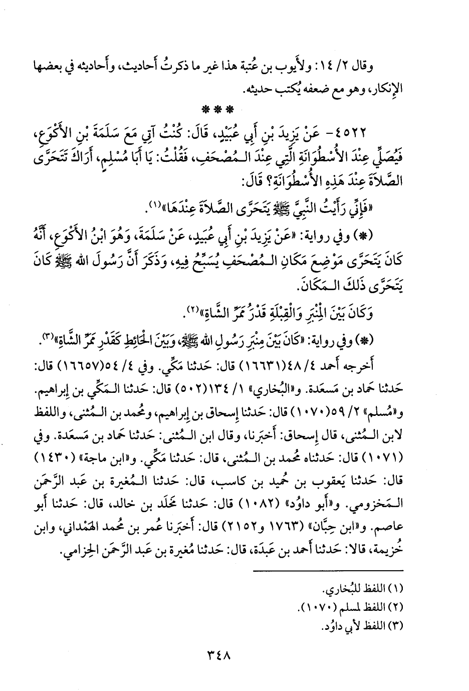 - وفي رواية: «عن يزيد بن أبي عبيد، عن سلمة، وهو ابن الأكوع، أنه كان يتحرى موضع مكان المصحف يسبح فيه، وذكر أن رسول الله صَلى الله عَليه وسَلم كان يتحرى ذلك المكان.