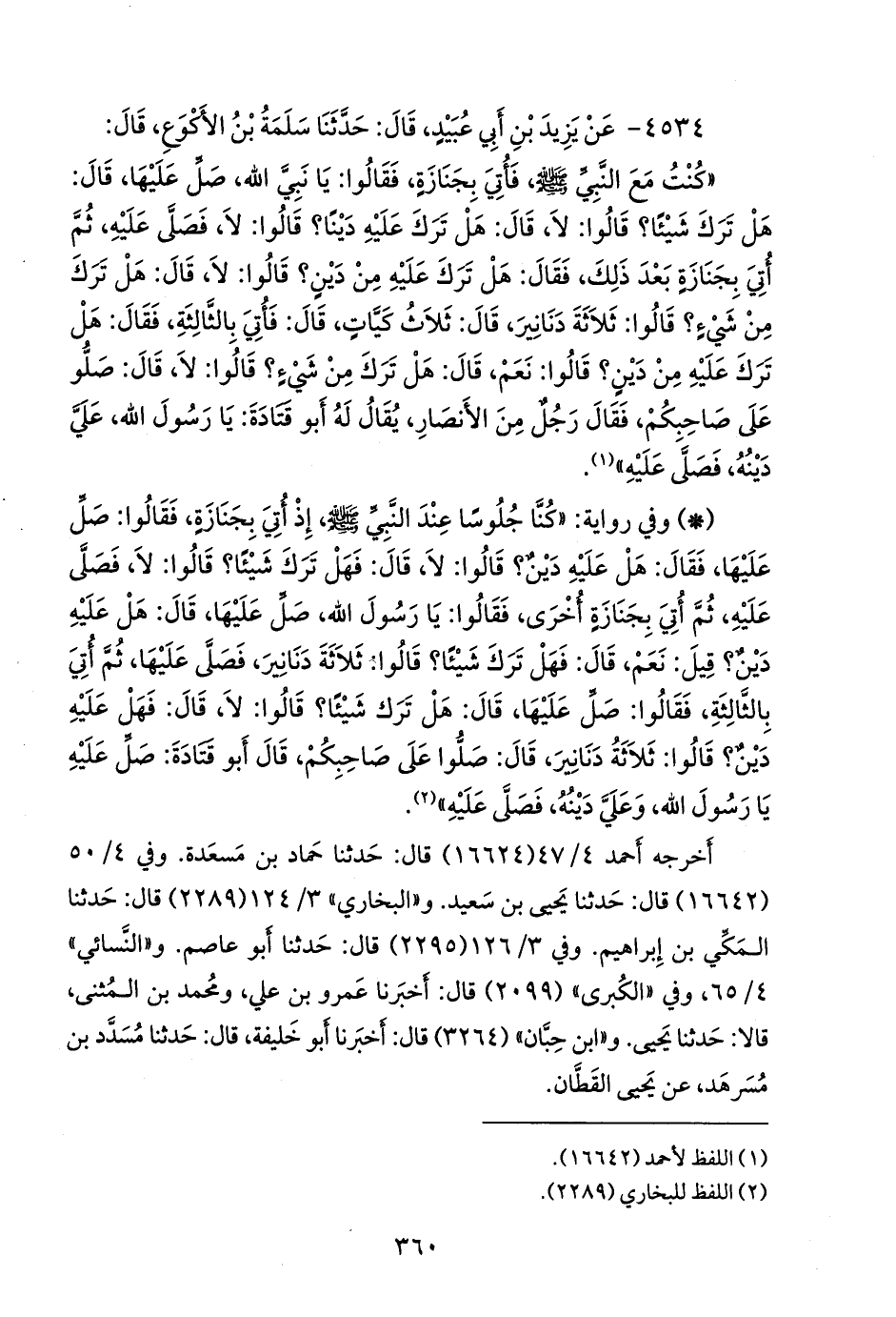 «كنت مع النبي صَلى الله عَليه وسَلم فأتي بجِنازة، فقالوا: يا نبي الله، صل عليها, قال: هل ترك شيئا؟ قالوا: لا، قال: هل ترك عليه دينا؟ قالوا: لا, فصلى عليه, ثم أتي بجِنازة بعد ذلك, فقال: هل ترك عليه من دين؟ قالوا: لا، قال: هل ترك من شيء؟ قالوا: ثلاثة دنانير، قال: ثلاث كيات، قال: فأتي بالثالثة، فقال: هل ترك عليه من دين؟ قالوا: نعم, قال: هل ترك من شيء؟ قالوا: لا، قال: صلو على صاحبكم, فقال رجل من الأنصار، يقال له أَبو قتادة: يا رسول الله، علي دينه, فصلى عليه» (¬١).