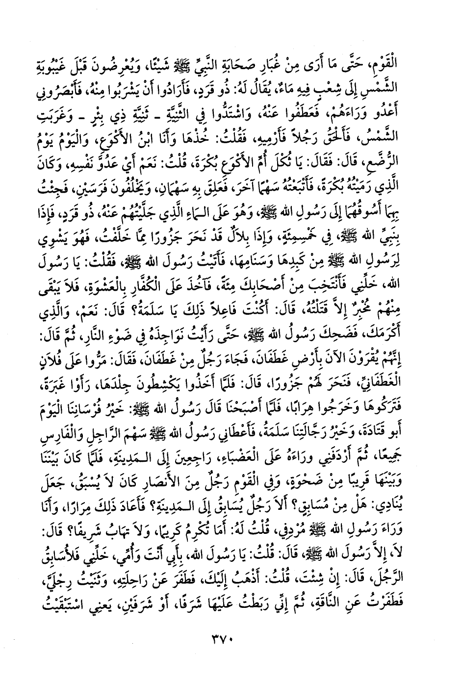 فإذا بنبي الله صَلى الله عَليه وسَلم في خمس مئة، وإذا بلال قد نحر جزورا مما خلفت، فهو يشوي لرسول الله صَلى الله عَليه وسَلم من كبدها وسنامها، فأتيت رسول الله صَلى الله عَليه وسَلم فقلت: يا رسول الله، خلني فأنتخب من أصحابك مئة، فآخذ على الكفار بالعشوة، فلا يبقى منهم مخبر إلا قتلته، قال: أكنت فاعلا ذلك يا سلمة؟ قال: نعم، والذي أكرمك، فضحك رسول الله صَلى الله عَليه وسَلم حتى رأيت نواجذه في ضوء النار، ثم قال: إنهم يقرون الآن بأرض غطفان، فجاء رجل من غطفان، فقال: مروا على فلان الغطفاني، فنحر لهم جزورا، قال: فلما أخذوا يكشطون جلدها، رأوا غبرة، فتركوها وخرجوا هرابا، فلما أصبحنا قال رسول الله صَلى الله عَليه وسَلم: خير فرساننا اليوم أَبو قتادة، وخير رجالتنا سلمة، فأعطاني رسول الله صَلى الله عَليه وسَلم سهم الراجل والفارس جميعا، ثم أردفني وراءه على العضباء، راجعين إلى المدينة، فلما كان بيننا وبينها قريبا من ضحوة، وفي القوم رجل من الأنصار كان لا يسبق، جعل ينادي: هل من مسابق؟ ألا رجل يسابق إلى المدينة؟ فأعاد ذلك مرارا، وأنا وراء رسول الله صَلى الله عَليه وسَلم مردفي، قلت له: أما تكرم كريما، ولا تهاب شريفا؟ قال: لا، إلا رسول الله صَلى الله عَليه وسَلم قال: قلت: يا رسول الله، بأبي أنت وأمي، خلني فلأسابق الرجل، قال: إن شئت، قلت: أذهب إليك، فطفر عن راحلته، وثنيت رجلي، فطفرت عن الناقة، ثم إني ربطت عليها شرفا، أو شرفين، يعني استبقيت