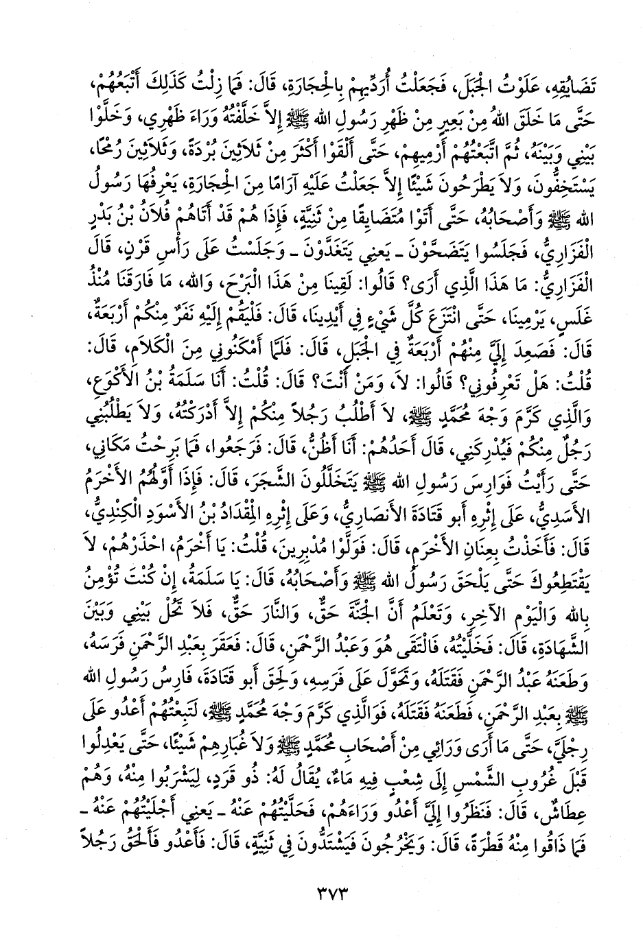 قال: فصعد إلي منهم أربعة في الجبل، قال: فلما أمكنوني من الكلام، قال: قلت: هل تعرفوني؟ قالوا: لا، ومن أنت؟ قال: قلت: أنا سلمة بن الأكوع، والذي كرم وجه محمد صَلى الله عَليه وسَلم لا أطلب رجلا منكم إلا أدركته، ولا يطلبني رجل منكم فيدركني، قال أحدهم: أنا أظن، قال: فرجعوا، فما برحت مكاني، حتى رأيت فوارس رسول الله صَلى الله عَليه وسَلم يتخللون الشجر، قال: فإذا أولهم الأخرم الأسدي، على إثره أَبو قتادة الأَنصاري، وعلى إثره المقداد بن الأسود الكندي، قال: فأخذت بعنان الأخرم، قال: فولوا مدبرين، قلت: يا أخرم، احذرهم، لا يقتطعوك حتى يلحق رسول الله صَلى الله عَليه وسَلم وأصحابه، قال: يا سلمة، إن كنت تؤمن بالله واليوم الآخر، وتعلم أن الجنة حق، والنار حق، فلا تحل بيني وبين الشهادة، قال: فخليته، فالتقى هو وعبد الرَّحمَن، قال: فعقر بعبد الرَّحمَن فرسه، وطعنه عبد الرَّحمَن فقتله، وتحول على فرسه، ولحق أَبو قتادة، فارس رسول الله صَلى الله عَليه وسَلم بعبد الرَّحمَن، فطعنه فقتله، فوالذي كرم وجه محمد صَلى الله عَليه وسَلم لتبعتهم أعدو على رجلي، حتى ما أرى ورائي من أصحاب محمد صَلى الله عَليه وسَلم ولا غبارهم شيئا، حتى يعدلوا قبل غروب الشمس إلى شعب فيه ماء، يقال له: ذو قرد، ليشربوا منه، وهم عطاش، قال: فنظروا إلي أعدو وراءهم، فحليتهم عنه، يعني أجليتهم عنه ـ فما ذاقوا منه قطرة، قال: ويخرجون فيشتدون في ثنية، قال: فأعدو فألحق رجلا