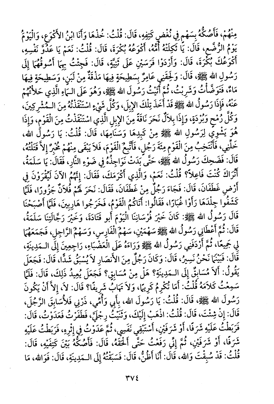 قال: قلت: يا رسول الله، خلني، فأنتخب من القوم مئة رجل، فأتبع القوم، فلا يبقى منهم مخبر إلا قتلته، قال: فضحك رسول الله صَلى الله عَليه وسَلم حتى بدت نواجذه في ضوء النار، فقال: يا سلمة، أتراك كنت فاعلا؟ قلت: نعم، والذي أكرمك، فقال: إنهم الآن ليقرون في أرض غطفان، قال: فجاء رجل من غطفان، فقال: نحر لهم فلان جزورا، فلما كشفوا جلدها رأوا غبارا، فقالوا: أتاكم القوم، فخرجوا هاربين، فلما أصبحنا قال رسول الله صَلى الله عَليه وسَلم: كان خير فرساننا اليوم أَبو قتادة، وخير رجالتنا سلمة، قال: ثم أعطاني رسول الله صَلى الله عَليه وسَلم سهمين، سهم الفارس، وسهم الراجل، فجمعهما لي جميعا، ثم أردفني رسول الله صَلى الله عَليه وسَلم وراءه على العضباء، راجعين إلى المدينة، قال: فبينما نحن نسير، قال: وكان رجل من الأنصار لا يسبق شدا، قال: فجعل يقول: ألا مسابق إلى المدينة؟ هل من مسابق؟ فجعل يعيد ذلك، قال: فلما سمعت كلامه قلت: أما تكرم كريما، ولا تهاب شريفا؟ قال: لا، إلا أن يكون رسول الله صَلى الله عَليه وسَلم قال: قلت: يا رسول الله، بأبي وأمي، ذرني فلأسابق الرجل، قال: إن شئت، قال: قلت: اذهب إليك، وثنيت رجلي، فطفرت فعدوت، قال: فربطت عليه شرفا، أو شرفين، أستبقي نفسي، ثم عدوت في إثره، فربطت عليه شرفا، أو شرفين، ثم إني رفعت حتى ألحقه، قال: فأصكه بين كتفيه، قال: قلت: قد سبقت والله، قال: أنا أظن، قال: فسبقته إلى المدينة، قال: فوالله، ما