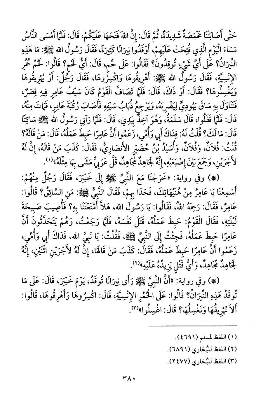 - وفي رواية: «خرجنا مع النبي صَلى الله عَليه وسَلم إلى خيبر، فقال رجل منهم: أسمعنا يا عامر من هنيهاتك، فحدا بهم، فقال النبي صَلى الله عَليه وسَلم: من السائق؟ قالوا: عامر، فقال: رحمه الله، فقالوا: يا رسول الله، هلا أمتعتنا به؟ فأصيب صبيحة ليلته، فقال القوم: حبط عمله، قتل نفسه، فلما رجعت، وهم يتحدثون أن عامرا حبط عمله، فجئت إلى النبي صَلى الله عَليه وسَلم فقلت: يا نبي الله، فداك أبي وأمي، زعموا أن عامرا حبط عمله، فقال: كذب من قالها، إن له لأجرين اثنين، إنه لجاهد مجاهد، وأي قتل يزيده عليه» (¬١).