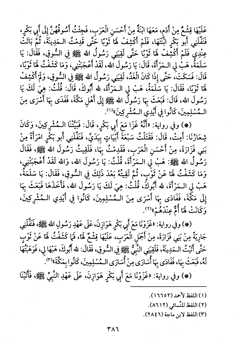 - وفي رواية: «غزونا مع أَبي بكر هوازن، على عهد رسول الله صَلى الله عَليه وسَلم فنفلني جارية من بني فزارة، من أجمل العرب، عليها قشع لها، فما كشفت لها عن ثوب حتى أتيت المدينة، فلقيني النبي صَلى الله عَليه وسَلم في السوق، فقال: لله أَبوك، هبها لي، فوهبتها له، فبعث بها، ففادى بها أسارى من أسارى المسلمين، كانوا بمكة» (¬٢).