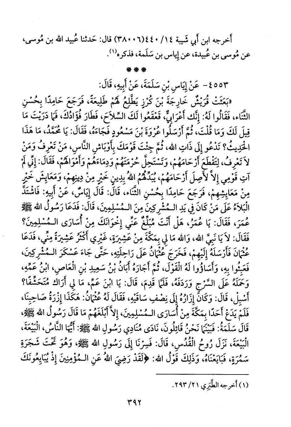 تحت الشجرة} قال: فبايع لعثمان إِحدى يديه على الأُخرى، فقال الناس: هنيئًا لأَبي عبد الله، يطوف بالبيت ونحن هاهنا، فقال رسول الله صَلى الله عَليهِ وسَلمَ: لو مكث كذا وكذا سنة، ما طاف حتى أَطوف». (¬١).