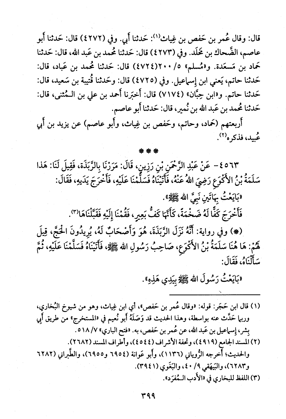 ٤٥٦٣ - عن عبد الرَّحمَن بن رَزين، قال: مررنا بالربذة، فقيل لنا: هذا سلمة بن الأكوع رضي الله عنه، فأتيناه فسلمنا عليه، فأخرج يديه، فقال: