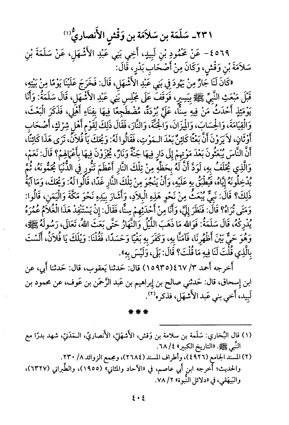 ٤٥٦٩ - عن محمود بن لبيد، أخي بني عبد الأشهل، عن سلمة بن سلامة بن وقش، وكان من أصحاب بدر، قال:
