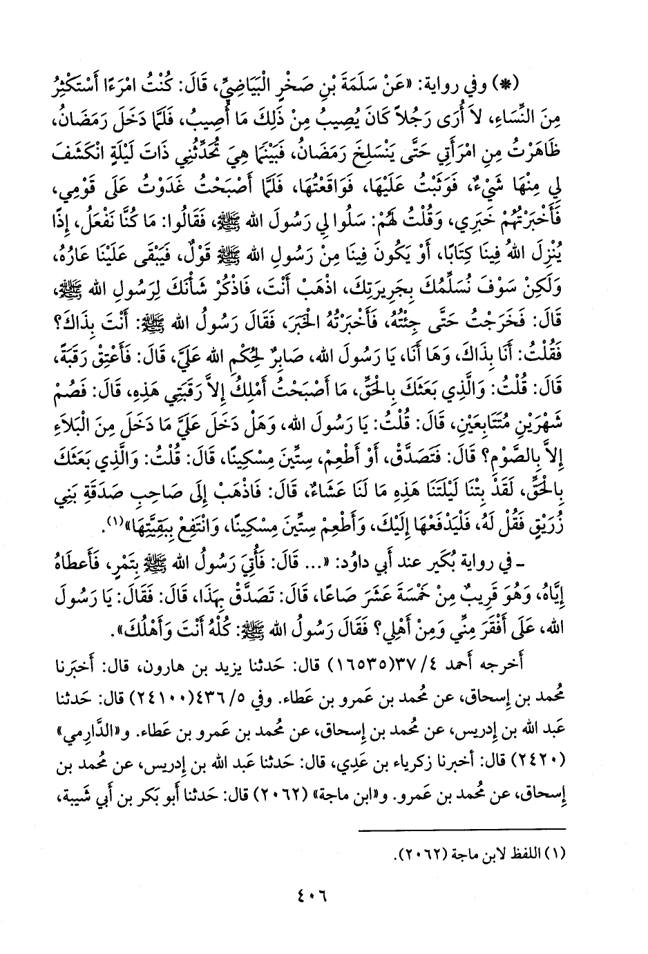 - وفي رواية: «عن سلمة بن صخر البياضي، قال: كنت امرءا أستكثر من النساء، لا أرى رجلا كان يصيب من ذلك ما أصيب، فلما دخل رمضان، ظاهرت من امرأتي حتى ينسلخ رمضان، فبينما هي تحدثني ذات ليلة انكشف لي منها شيء، فوثبت عليها، فواقعتها، فلما أصبحت غدوت على قومي، فأخبرتهم خبري، وقلت لهم: سلوا لي رسول الله صَلى الله عَليه وسَلم فقالوا: ما كنا نفعل، إذا ينزل الله فينا كتابا، أو يكون فينا من رسول الله صَلى الله عَليه وسَلم قول، فيبقى علينا عاره، ولكن سوف نسلمك بجريرتك، اذهب أنت، فاذكر شأنك لرسول الله صَلى الله عَليه وسَلم قال: فخرجت حتى جئته، فأخبرته الخبر، فقال رسول الله صَلى الله عَليه وسَلم: أنت بذاك؟ فقلت: أنا بذاك، وها أنا، يا رسول الله، صابر لحكم الله علي، قال: فأعتق رقبة، قال: قلت: والذي بعثك بالحق، ما أصبحت أملك إلا رقبتي هذه، قال: فصم شهرين متتابعين، قال: قلت: يا رسول الله، وهل دخل علي ما دخل من البلاء إلا بالصوم؟ قال: فتصدق، أو أطعم، ستين مسكينا، قال: قلت: والذي بعثك بالحق، لقد بتنا ليلتنا هذه ما لنا عشاء، قال: فاذهب إلى صاحب صدقة بني زريق فقل له، فليدفعها إليك، وأطعم ستين مسكينا، وانتفع ببقيتها» (¬١).