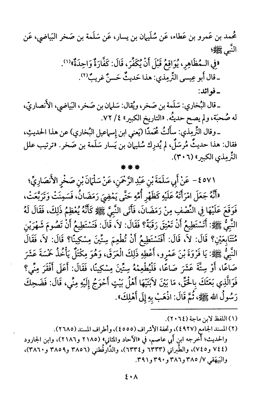 - قلنا: إِسناده ضعيفٌ؛ قال البخاري: سلمة بن صخر، ويقال: سلمان بن صخر، البياضي، الأَنصاري، له صحبة، ولم يصح حديثه. «التاريخ الكبير» ٤/ ٧٢.