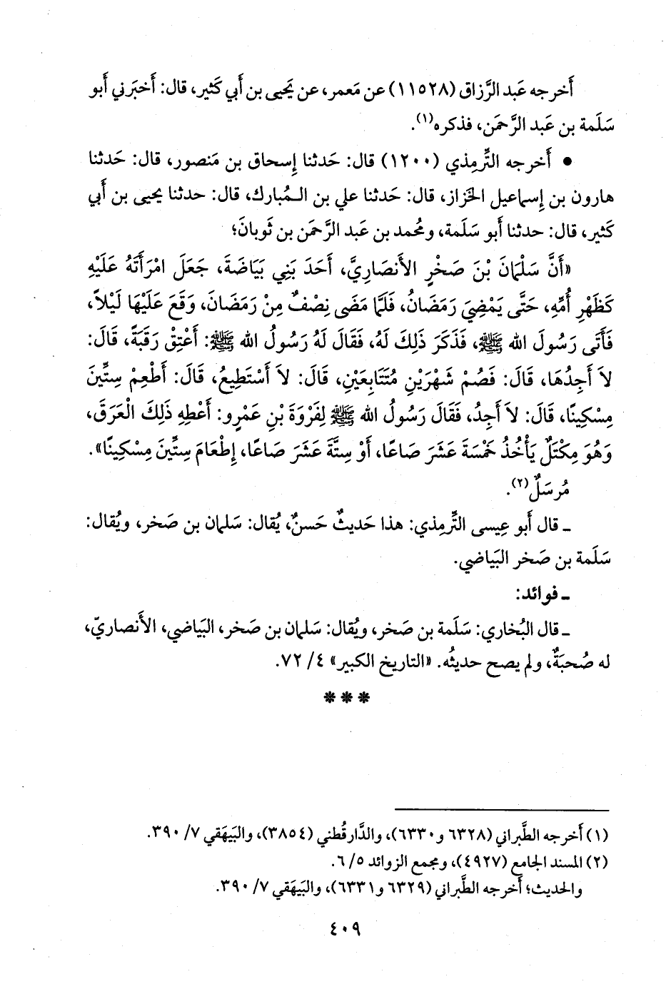 - قلنا: إِسناده ضعيفٌ؛ قال البخاري: سلمة بن صخر، ويقال: سلمان بن صخر، البياضي، الأَنصاري، له صحبة، ولم يصح حديثه. «التاريخ الكبير» ٤/ ٧٢.