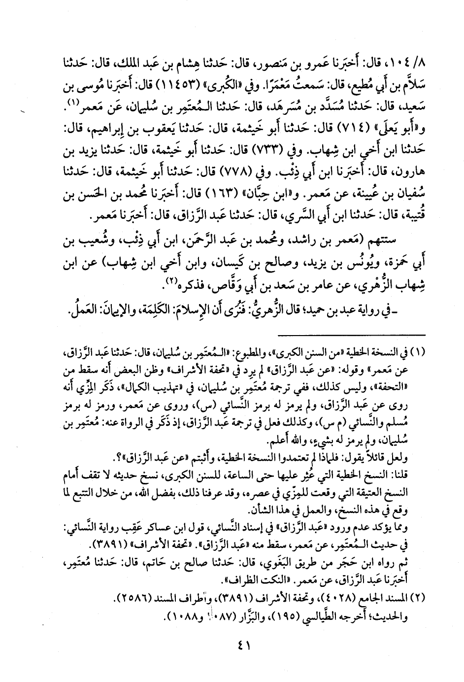 وفي «الكبرى» (١١٤٥٣) قال: أخبرنا موسى بن سعيد، قال: حدثنا مُسَدَّد بن مُسَرهَد، حدثنا المُعتَمِر بن سليمان، حدثنا عبد الرزاق (¬١)، عن مَعمر. و «أَبو يَعلى» (٧١٤) قال: حدثنا أَبو خيثمة، قال: حدثنا يعقوب بن إبراهيم، قال: حدثنا ابن أخي ابن شهاب. وفي (٧٣٣) قال: حدثنا أَبو خيثمة، قال: حدثنا يزيد بن هارون، قال: أخبرنا ابن أبي ذِئب. وفي (٧٧٨) قال: حدثنا أَبو خيثمة، قال: حدثنا سفيان بن عُيينة، عن معمر. و «ابن حِبَّان» (١٦٣) قال: أخبرنا محمد بن الحسن بن قتيبة، قال: حدثنا ابن أبي السري, قال: حدثنا عبد الرزاق, قال: أخبرنا معمر.