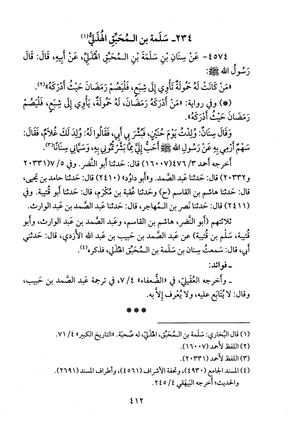 ثلاثتهم (أَبو النضر هاشم بن القاسم، وعبد الصمد بن عبد الوارث، وأَبو قتيبة، سَلْم بن قُتيبة) عن عبد الصمد بن حبيب الأزدي, قال: حدثني أبي، قال: سمعت سنان بن سلمة بن المُحَبَّق الهذلي، فذكره (¬٤).