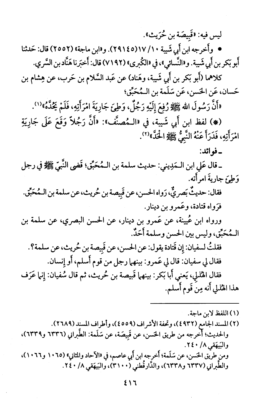 - قلنا: إِسناده ضعيفٌ؛ قال علي بن المديني: حديث سلمة بن المُحَبَّق؛ قضى النبي صَلى الله عَليه وسَلم في رجل وطئ جارية امرأته.