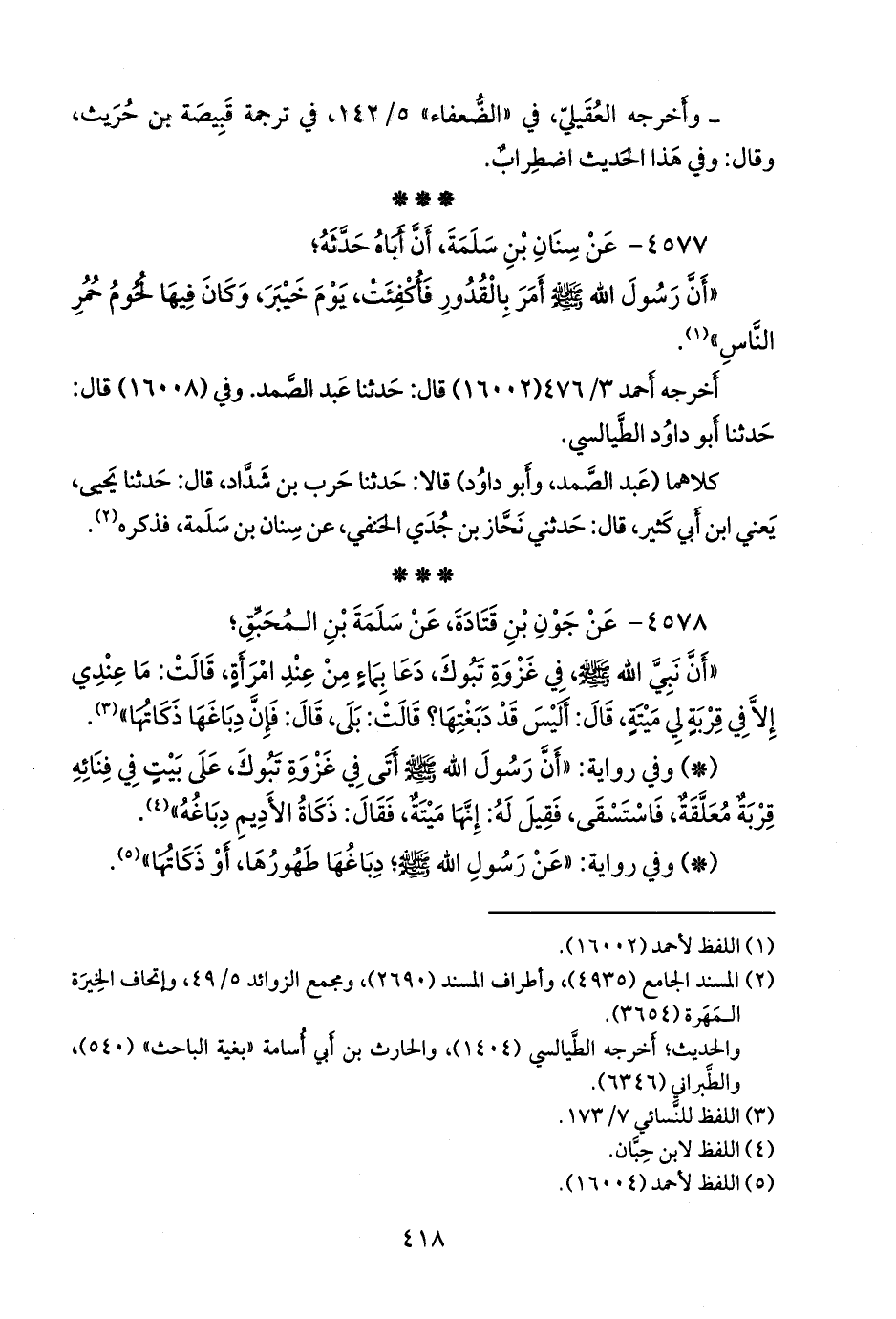 - قال أَبو بَكر الأَثرم: سمعتُ أَبا عبد الله، يعني أَحمد بن حنبل، وسُئل عن حديث سلمة بن المُحَبَّق، عن النبي صَلى الله عَليه وسَلم في الحُمُر الأهلية، فقال: حديثُ يحيى بن أبي كثير، عن نَحَّاز بن جُدَي الحنفي.