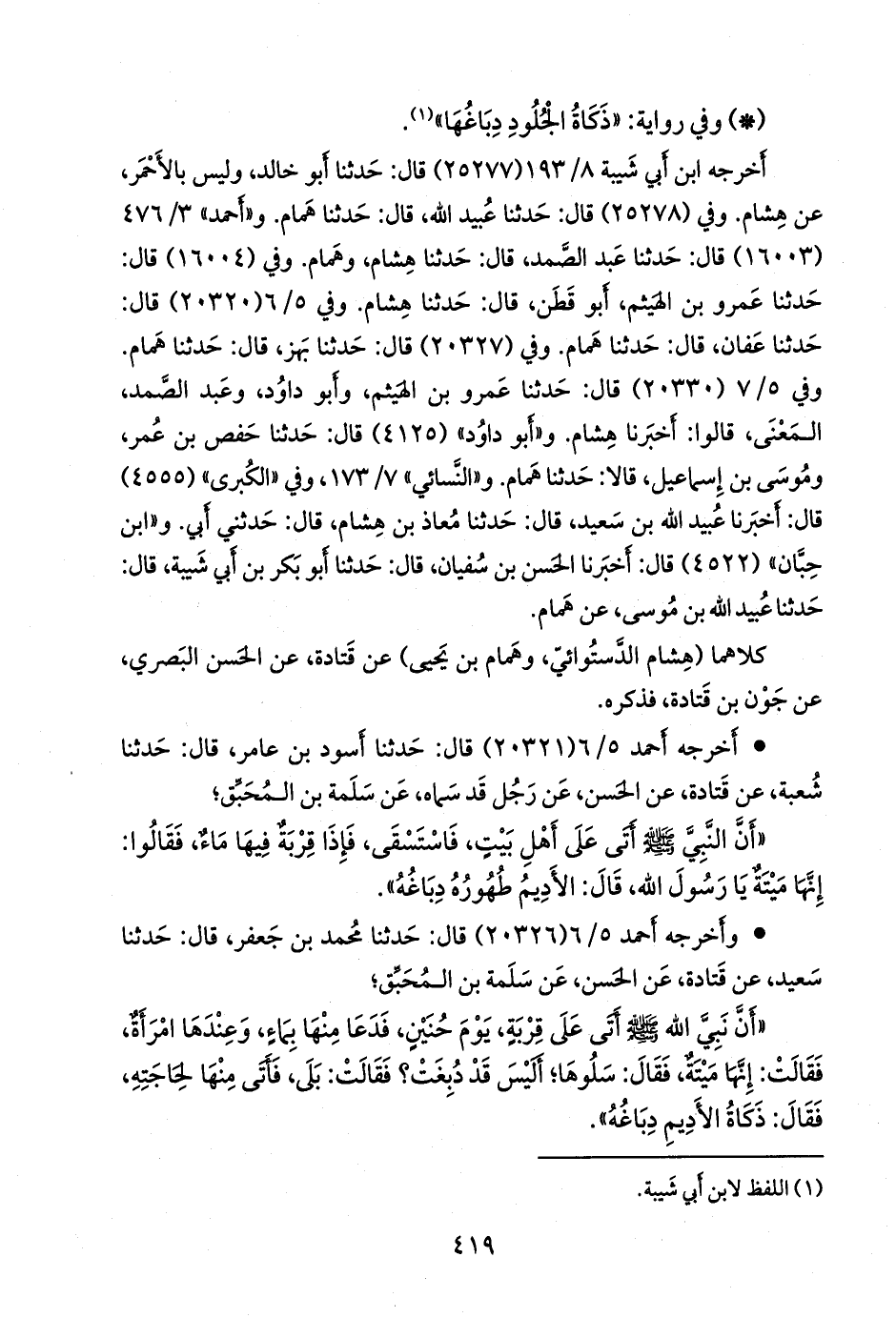 «أن نبي الله صَلى الله عَليه وسَلم أتى على قربة، يوم حنين، فدعا منها بماء، وعندها امرأة، فقالت: إنها ميتة، فقال: سلوها؛ أليس قد دبغت؟ فقالت: بلى، فأتى منها لحاجته، فقال: ذكاة الأديم دباغه».