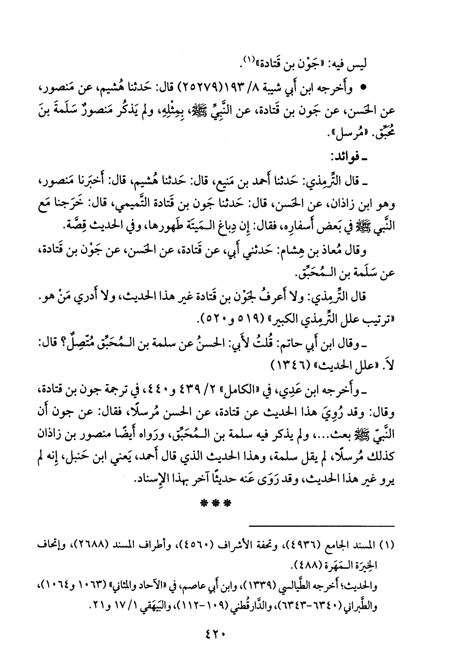 - وأخرجه ابن عَدي في «الكامل» ٢/ ٤٣٩ و ٤٤٠، في مناكير جون بن قتادة، وقال: وقد روي هذا الحديث عن قتادة، عن الحسن مرسلا، فقال: عن جون أن النبي صَلى الله عَليه وسَلم بعث ... ، ولم يذكر فيه سلمة بن المُحَبَّق، ورواه أيضا منصور بن زاذان كذلك مرسلا، لم يقل سلمة، وهذا الحديث الذي قال أحمد، يعني ابن حنبل، إنه لم يرو غير هذا الحديث، وقد روى عنه حديثا آخر بهذا الإسناد.